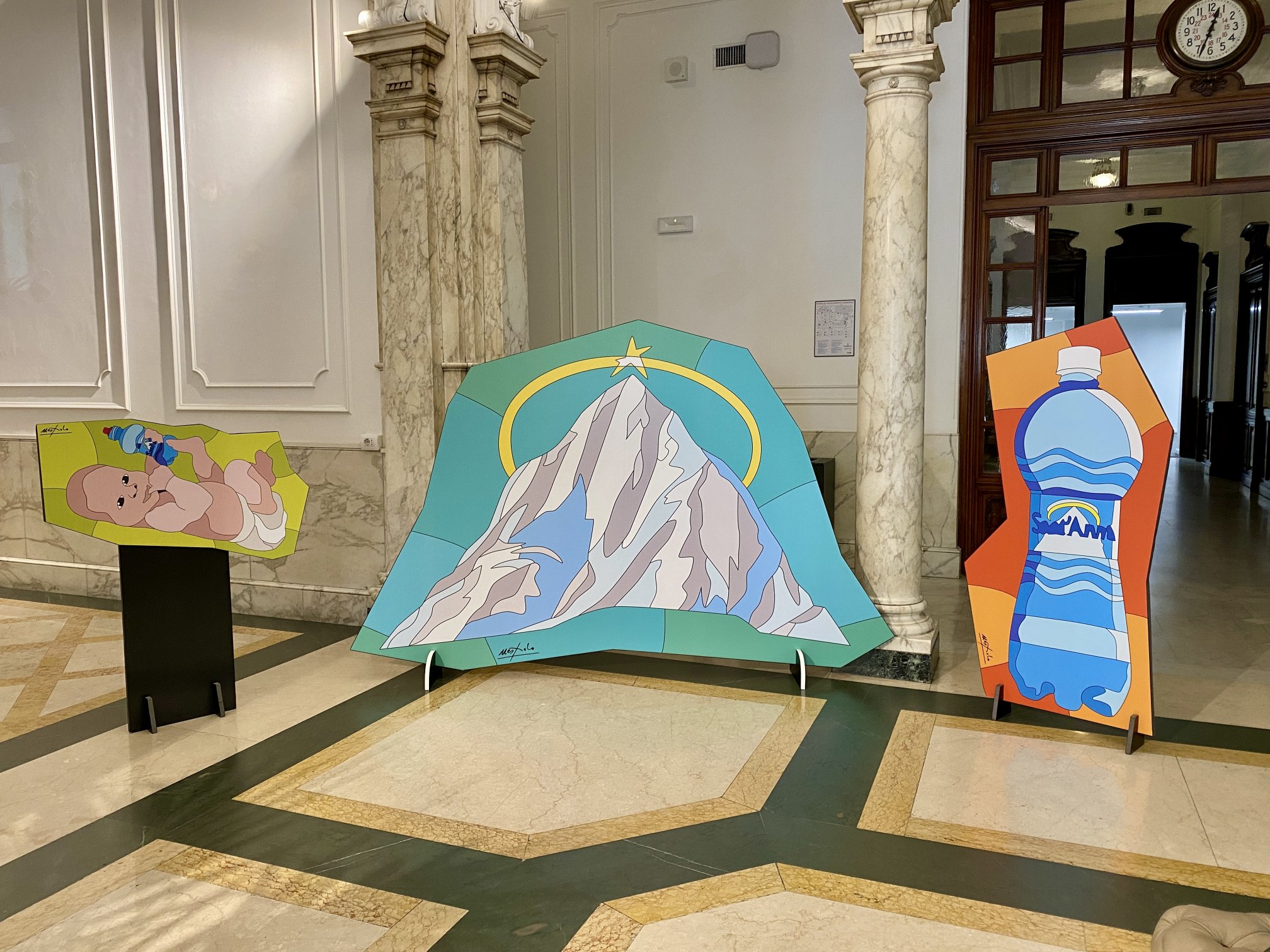 - Ugo Nespolo: figura di spicco dell'arte italiana contemporanea e del panorama artistico internazionale, è noto per la sua vasta e variegata produzione artistica, che spazia dalla pittura al cinema sperimentale, dalla scultura al design. La sua arte è caratterizzata da uno stile giocoso e colorato, spesso ricco di riferimenti alla cultura pop e al mondo del cinema. Lungo le vie di Torino possiamo trovare mosaici, murales e installazioni realizzati dall’artista biellese che sta lavorando ad un importante progetto artistico sulla facciata della nuova sede di Orbassano (TO) di Acqua Sant’Anna: colori brillanti e forme geometriche, creatività e pop art, con uno stile unico. Tre frammenti reali di questa grande opera – la montagna, la bottiglia e il bambino – sono tra le opere esposte all’Acqua Sant’Anna Art Collection.
