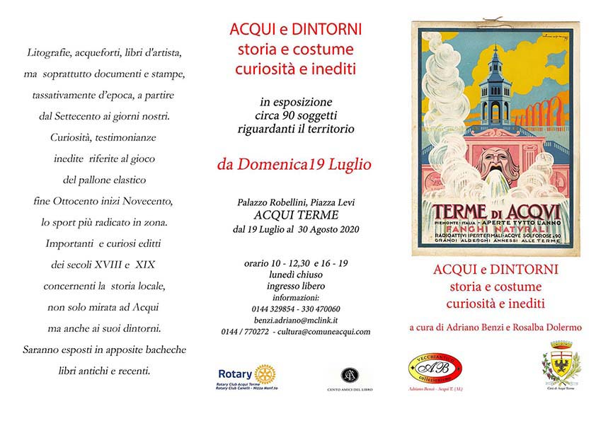 ACQUI e DINTORNI storia e costume - curiosità e inediti a cura di Adriano Benzi e Rosalba Dolermo Acqui Terme Palazzo Robellini - Piazza Levi dal 19 Luglio al 30 Agosto 2020 La mostra " Acqui e Dintorni , storia e costume - curiosità e inediti". consiste nell'esposizione di circa 90 esemplari Litografie, acqueforti, libri d'artista, ma soprattutto documenti e stampe, tassativamente d’epoca, a partire dal Settecento ai giorni nostri. Curiosità, testimonianze inedite riferite al gioco del pallone elastico fine Ottocento inizi Novecento, lo sport più radicato in zona. Importanti e curiosi editti dei secoli XVIII e XIX concernenti la storia locale, non solo mirata ad Acqui ma anche ai suoi dintorni. Esposte in apposite bacheche libri e pubblicazioni antiche. A corredo dell’esposizione che si sviluppa nelle quattro sale d’arte di Palazzo Robellini un catalogo con tutte le immagini dei soggetti esposti. Testi di Gianfranco Schialvino. NATURALMENTE SARA’ ASSICURATO IL RISPETTO DI TUTTE LE REGOLE IN VIGORE PER LA TUTELA DELLA SALUTE I locali saranno accuratamente igienizzati, ed il personale di assistenza alla mostra avrà come regola la massima attenzione che tutti i visitatori siano muniti di mascherine e opportunamente distanziati. Data e orario: dal 19 Luglio al 30 Agosto 2020 da Martedì a Domenica 10 - 12,30 e 16 - 19 Lunedì chiuso - ingresso gratuito - Catalogo in mostra info: rosalba.dolermo@alice.it - benzi.adriano@mclink.it - info@vecchiantico.com cultura@comuneacqui.com - 0144 770272 http://www.mostre-vecchiantico.com - 330 470060 con il patrocinio di Città di Acqui Terme, Rotary Club - Acqui Terme, Cento Amici del Libro