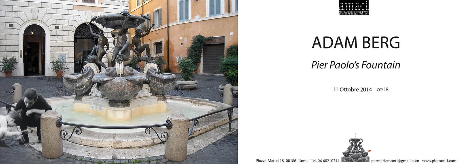 Adam Berg artista e filosofo con base a Los Angeles, identificando la fontana come “un contenitore di tempi, memorie e identità”, presenta per questa mostra una video-installazione intitolata Pier Paolo’s Fountain, dedicata a Pierpaolo Pasolini e alla fontana, che per una strana coincidenza, abitando per un periodo nella zona, osservava nelle sue passeggiate notturne. La magica fontana per Adam Berg condensa tre diversi cronotipi, ognuno con il suo proprio tempo-luogo che spezza la continuità dell'esperienza come flusso quotidiano: la piazza e la fontana nel centro storico di Roma; il primo film di Pasolini Accattone, girato nella periferia romana; e l'ingresso di scimmie e elefanti che attraversano l'immagine e destabilizzano la percezione. Un sogno nel sogno, a cui si aggiungono in galleria alcune opere su tela della serie Global Horizons e alcune sculture metalliche ripiegate su se stesse che diventano dei collettori di spazi in relazione dinamica con la proiezione del video.