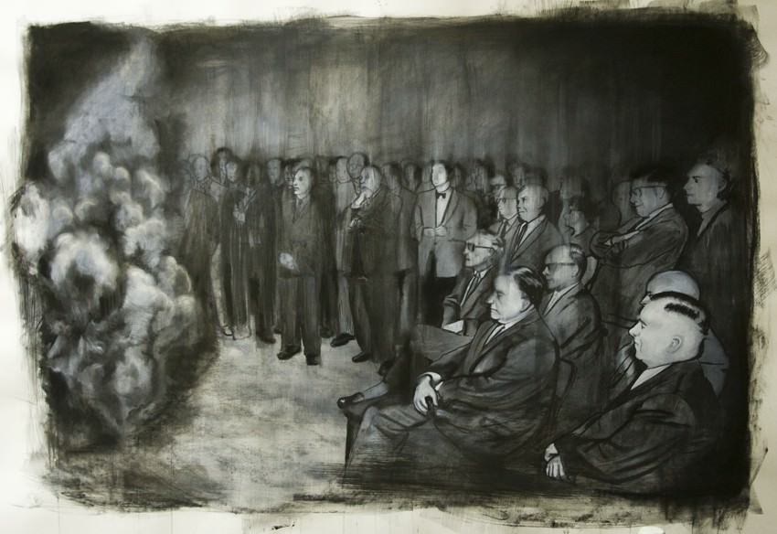 La serie di disegni, Lessons from the twilight kingdom, vedono protagonista un gruppo di persone ritratte in un atteggiamento di concentrazione e di ascolto, quasi di riverenza, di fronte ad una massa scura e informe, una sorte di “nube nera” che dissimula la presenza di un’entità misteriosa. Insieme a quei personaggi che la seguono/ fissano/ interpellano, diventa per l’artista un’immagine del potere sconosciuto - politico o religioso - che ci attrae, guida o governa, una riflessione su come ciò che determina il nostro agire sia in verità qualcosa di indefinito e oscuro.