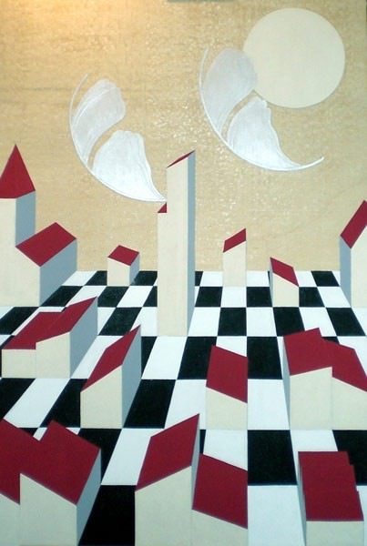 Città ideale, Farfalle che si mutano in fiore oltre un felice primo piano composto da foglie lanceolate dominate da sole onnipresente, una Panchina solitaria oppure l’Alba sono alcuni dei titoli di una rassegna che si conclude con un’opera composta secondo tre distinti piani nella quale il Gioco delle forme si evidenzia sempre più.