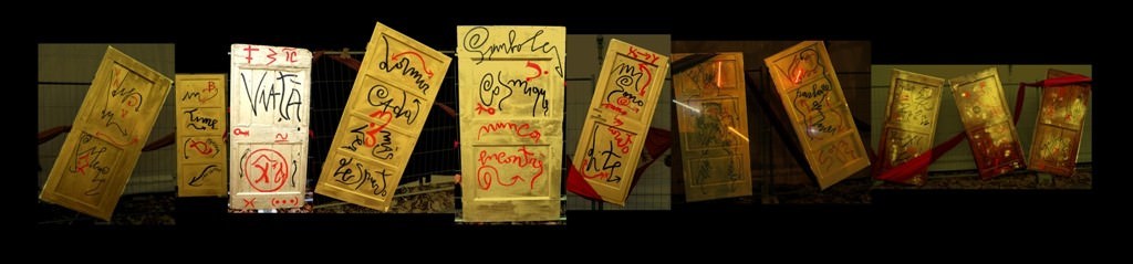30 collages del grande poeta arabo Adonis, interagiscono con una serie di opere – lavagne, carte, porte in foglia d’oro e specchi – di Marco Nereo Rotelli.