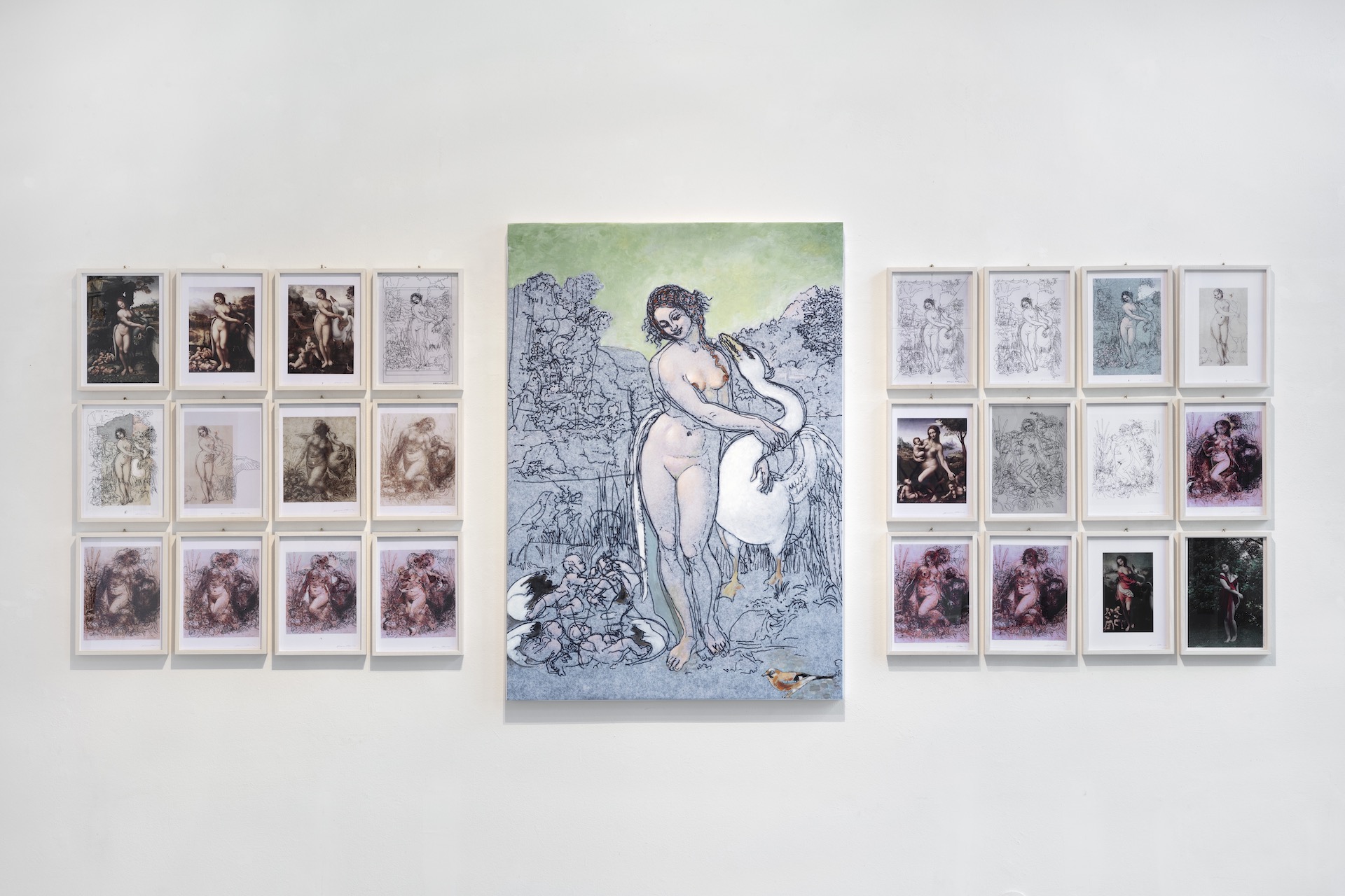 Il tema centrale della mostra trova un interessante contrappunto nella Leda ritrovata, opera che rappresenta il fulcro dell’esposizione e che, diversamente dai Visti per Caso, capovolge la continuità con il passato. Leda ritrovata è infatti una riflessione e una ricostruzione fantastica e simbolica della tradizione pittorica e il sistema di rilievo/sovrapposizione di alcuni tra i grandi maestri del passato. Quest’opera si configura come una duplice indagine storica e artistica, e riprova del metro critico che la stessa pittura (quando viene impiegata) mette in gioco continuamente, senza bisogno di parole.