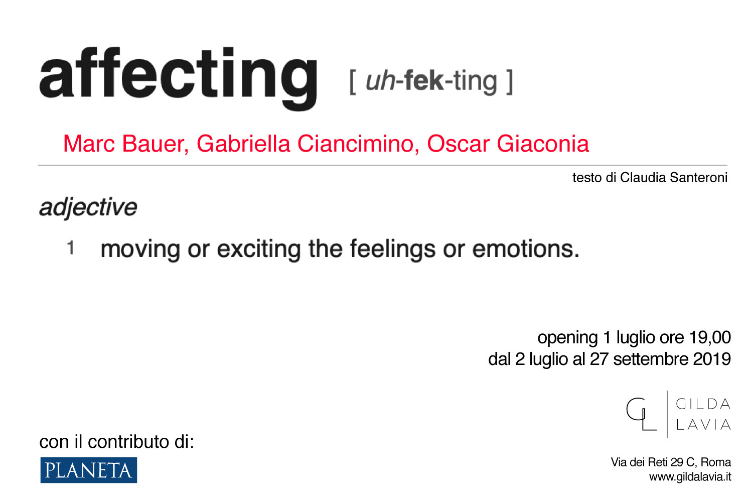 La Galleria Gilda Lavia di Roma ha il piacere di ospitare “Affecting”, mostra collettiva degli artisti Marc Bauer, Gabriella Ciancimino e Oscar Giaconia, che inaugurerà lunedì 1 luglio alle ore 19,00.