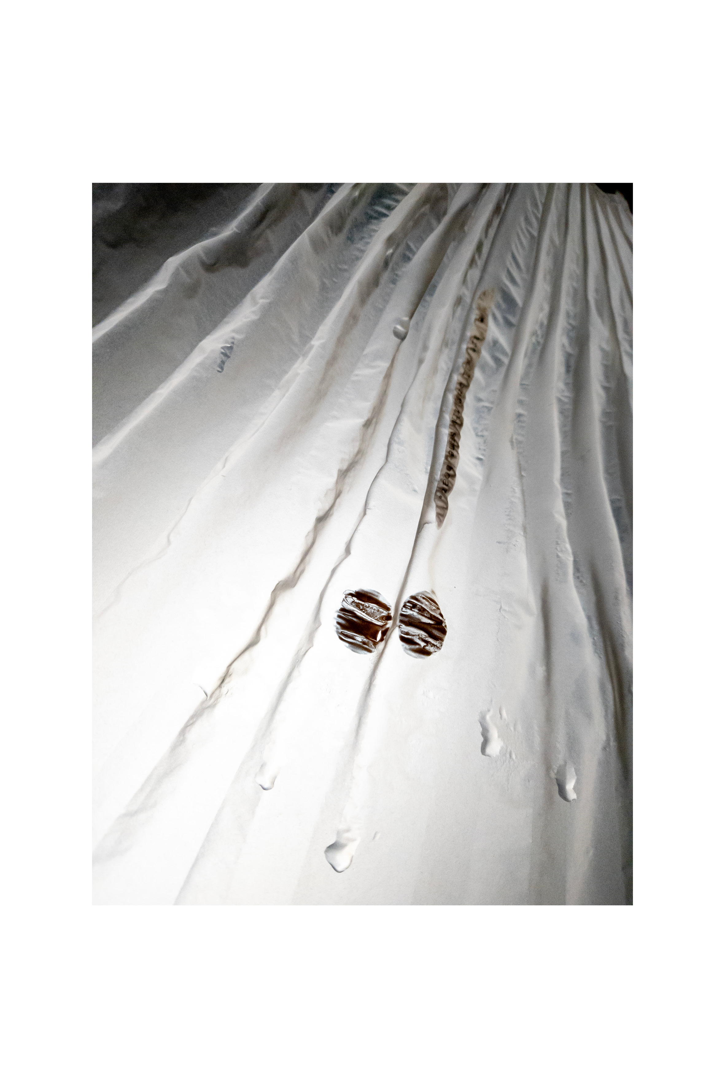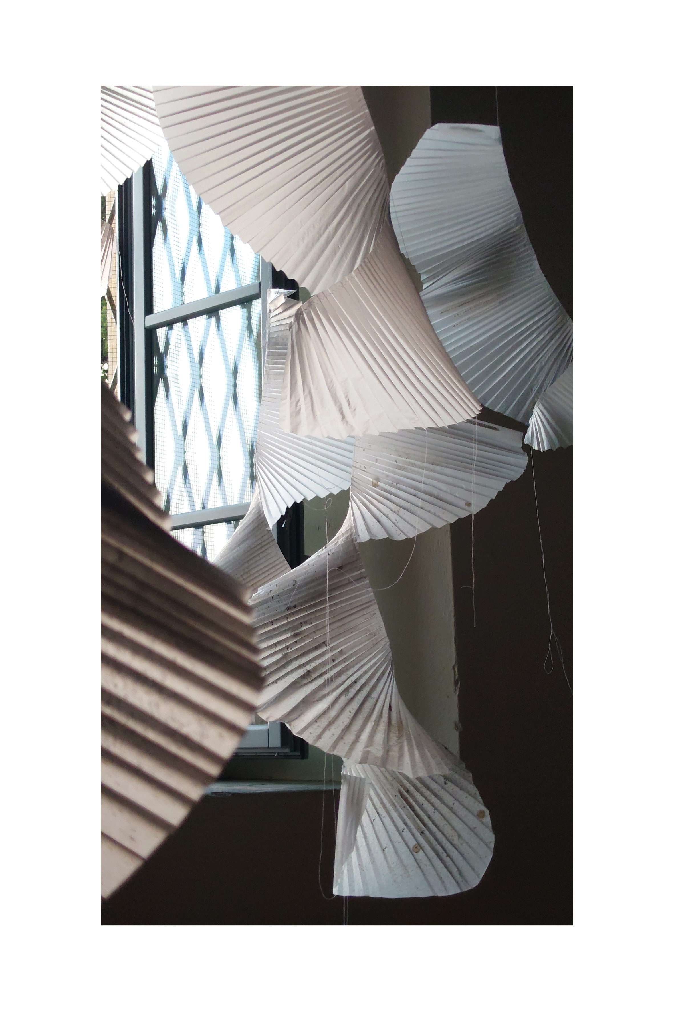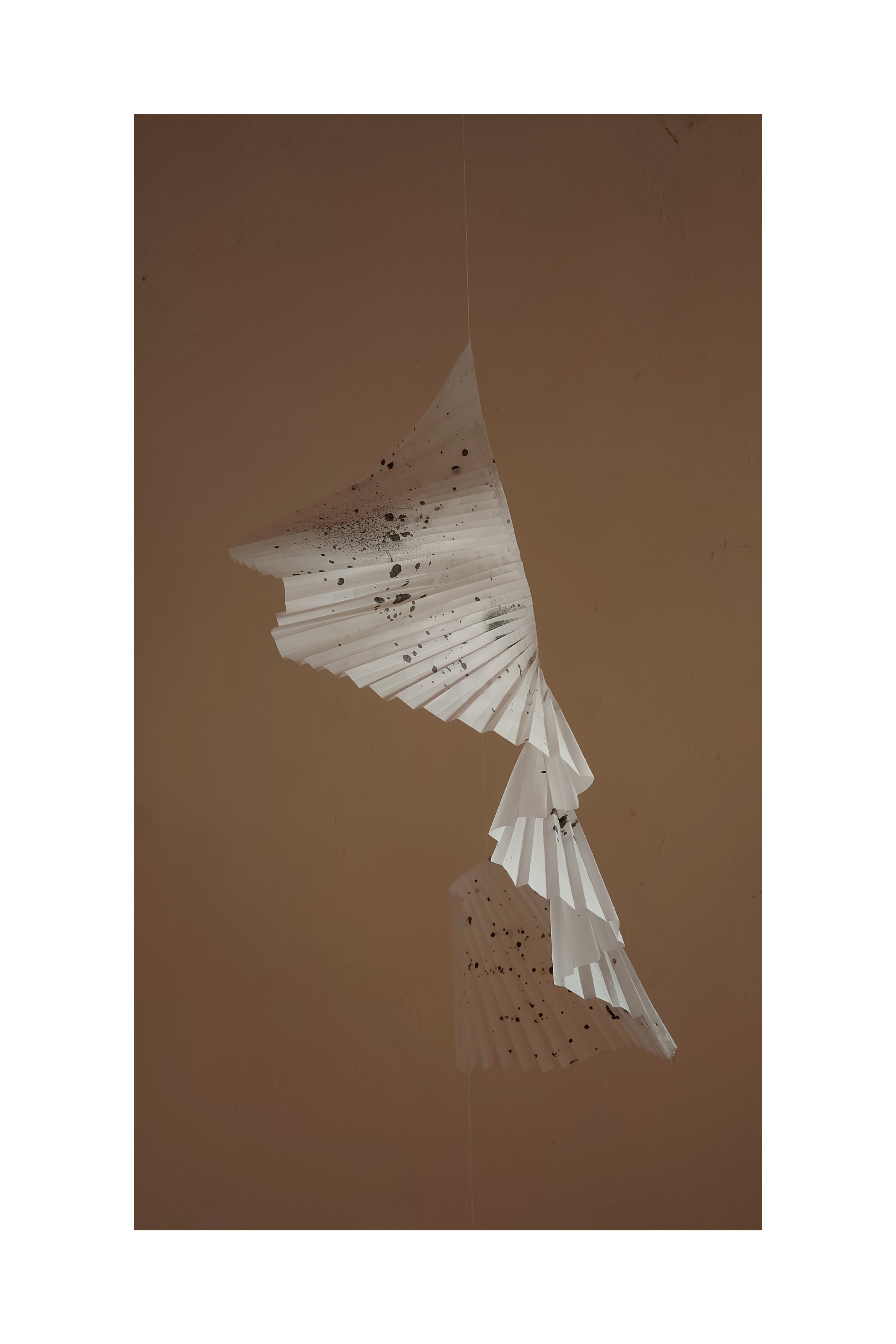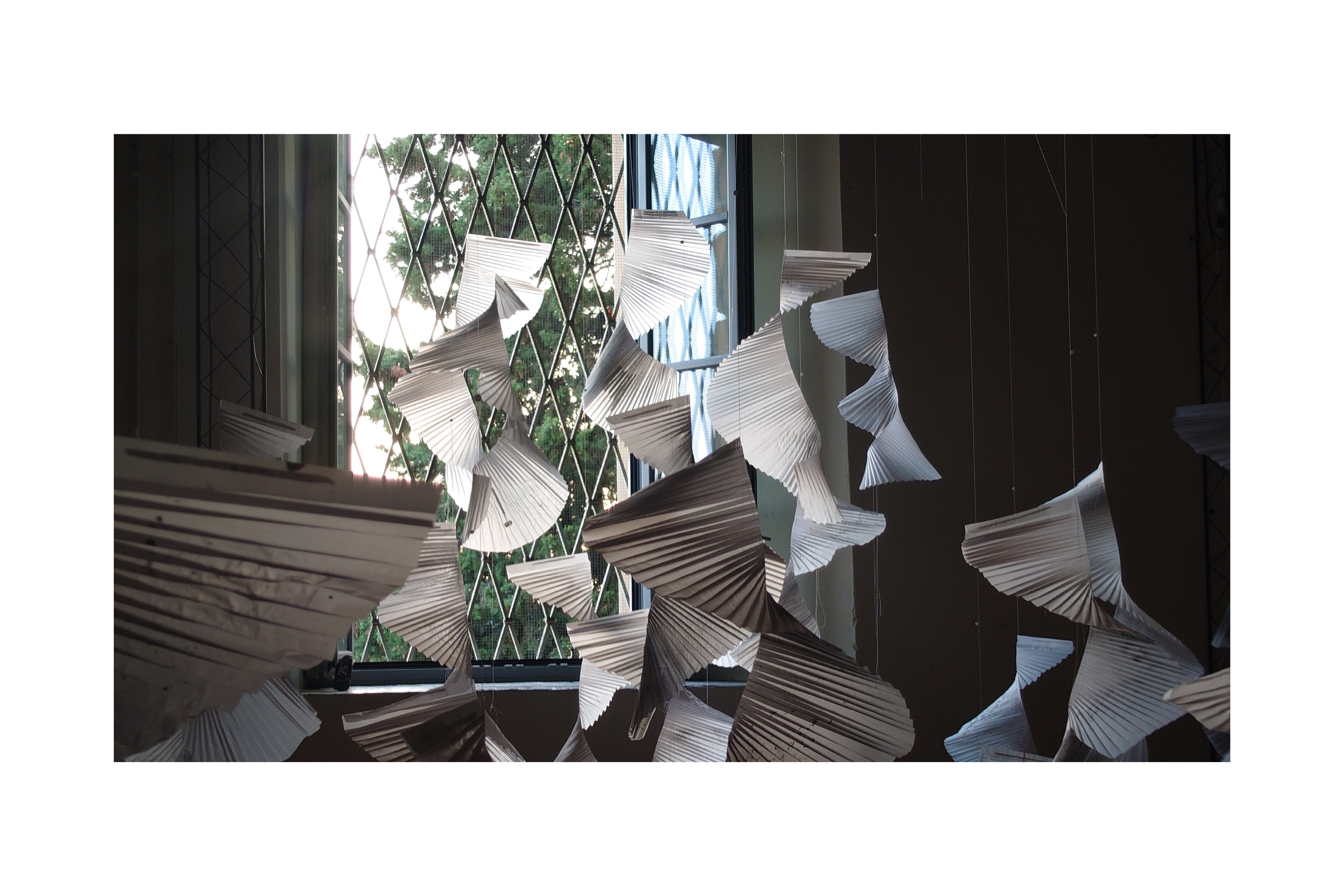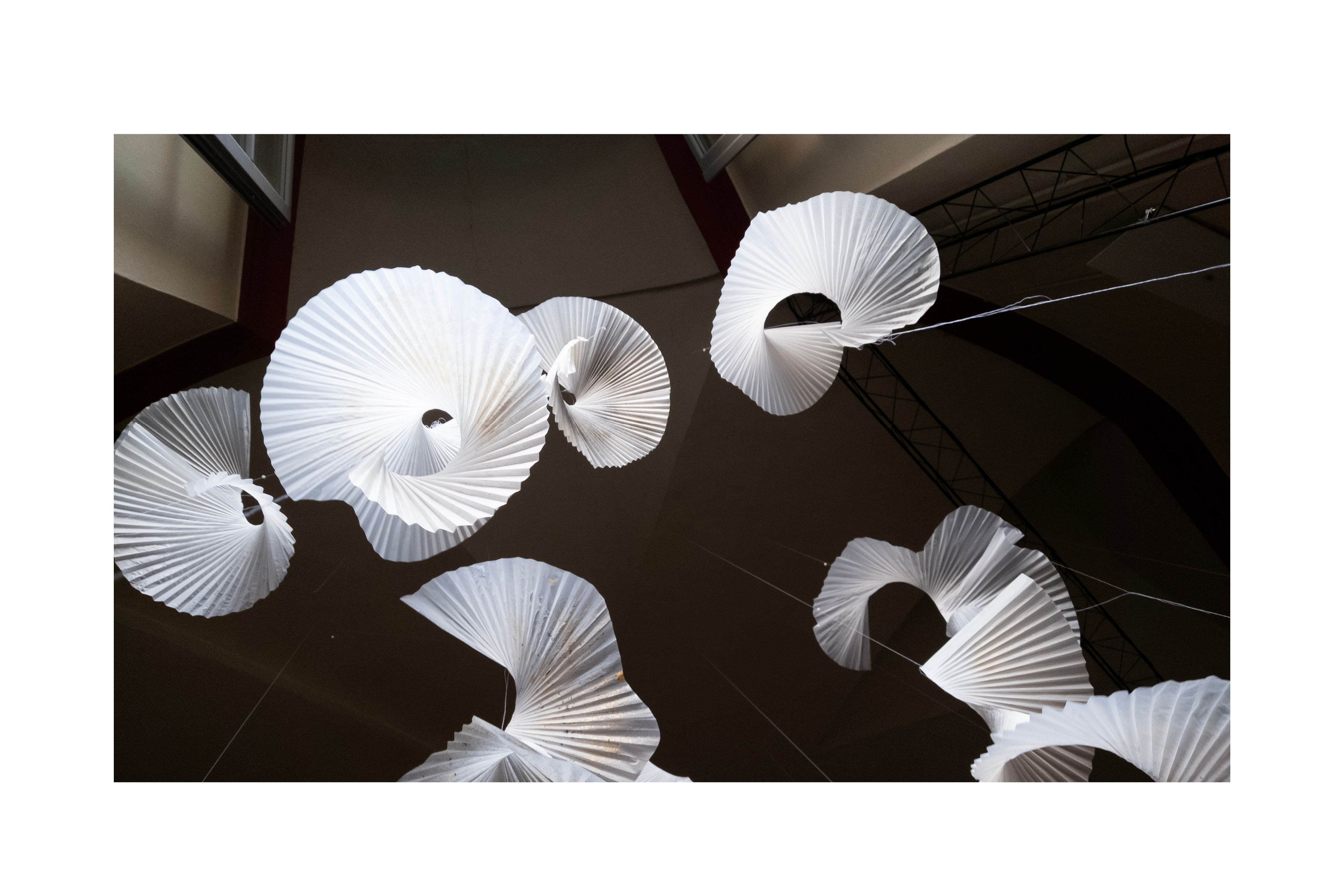Quarantuno vele numerate, composte di leggerissima carta plissettata, e a tratti velatamente pittata, formano una nuvola sospesa da attraversare a passo lento. Delicate cantastorie diafane, costantemente ridefinite dai colori mutevoli della luce naturale, girano piano su loro stesse, mosse solo dall’aria: una danza ipnotica, che segue il ritmo mutevole e fluttuante del brano 13:13, composto da Michele Agazzi per l’occasione. La musica che riverbera tra i muri del Teatro Sant’Andrea, è allo stesso tempo parte integrante dell’installazione ed espressione del peregrinare autonomo dell’autore tra immaginazione, sogno e realtà.