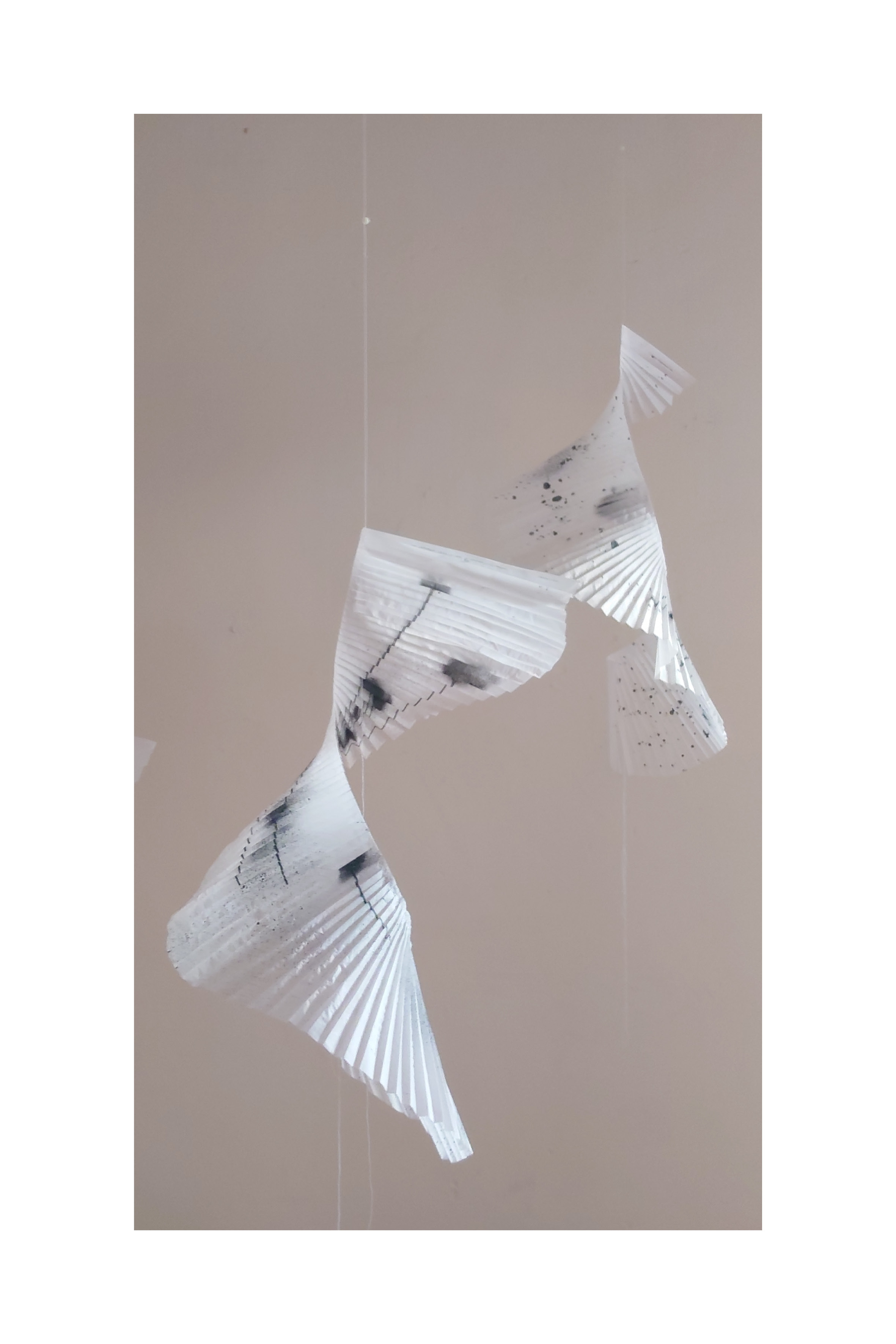 Quarantuno vele, composte di leggerissima carta plissettata, e a tratti velatamente pittata, formano una nuvola sospesa da attraversare a passo lento. Delicate cantastorie diafane realizzate da Barbara Ventura, danzano lente sulla musica di Michele Agazzi.