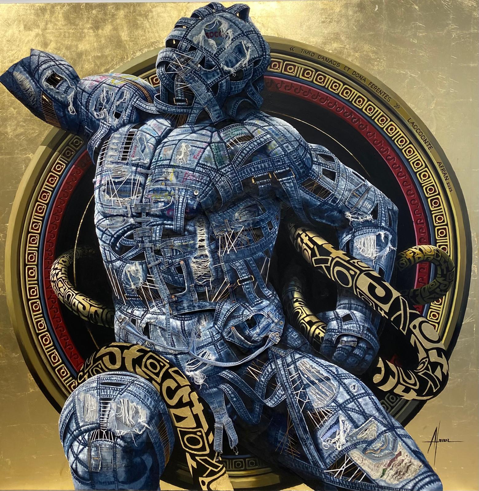“La trama del Mito” presenta oltre 20 opere di Afran che reinventano miti antichi e moderni attraverso denim, sculture e tele. La mostra indaga l’apparire nell’era dei social e invita a riflettere su identità, fragilità e nuovi culti digitali