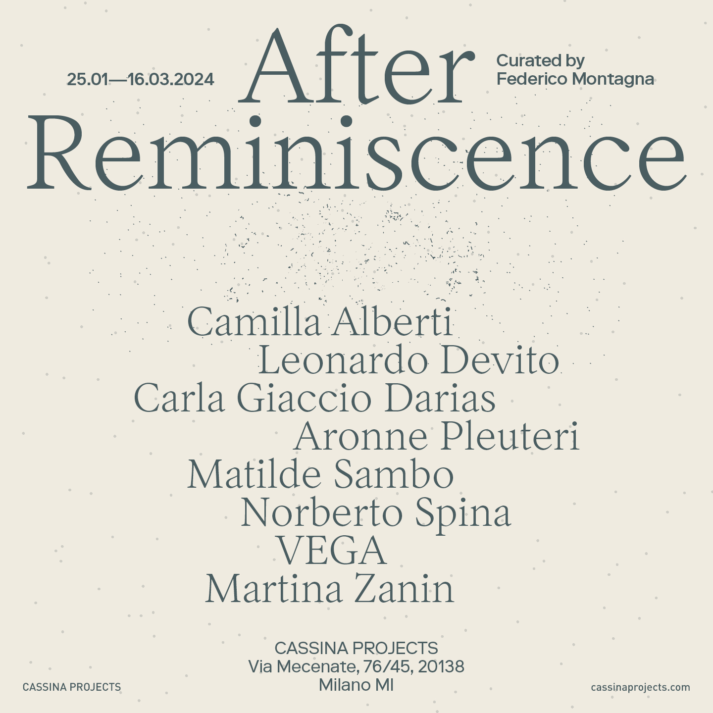 After Reminiscence, mostra inaugurale del programma 2024 di Cassina Projects, è un progetto a cura di Federico Montagna che coinvolge i lavori inediti di otto giovani artisti italiani: Camilla Alberti (*1995), Leonardo Devito (*1997), Carla Giaccio Darias (*1998), Aronne Pleuteri (*2001), Matilde Sambo (*1993), Norberto Spina (*1995), VEGA (Francesca Pionati *1990 e Tommaso Arnaldi *1993), Martina Zanin (*1994).