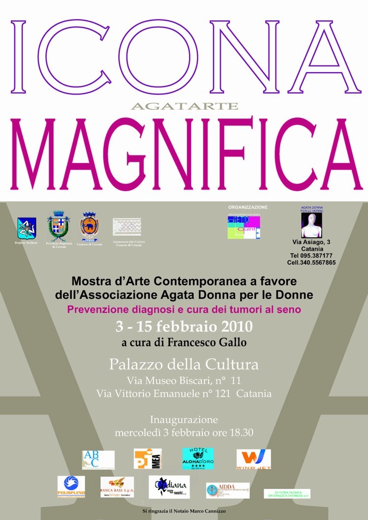 L’Associazione culturale Dietro le quinte, la galleria Arionte Arte contemporanea e l’associazione ONLUS “Agata donna per le donne” organizzano la 3ª edizione della mostra d’arte contemporanea di beneficenza Agatarte Icona Magnifica una mostra d’arte contemporanea a scopo benefico a favore dell’associazione Agata donna per le donne Onlus con il patrocinio della Presidenza della Regione Siciliana, Assessorato ai beni culturali del Comune di Catania, Assessorato ai beni culturali della Provincia Regionale di Catania, Accademia di Belle Arti di Catania.