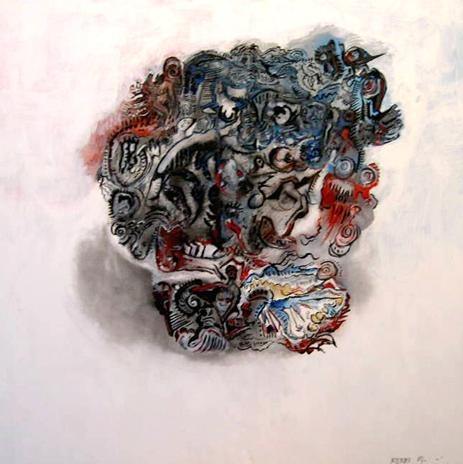 Una matassa aggrovigliata di segni, dalla quale esce una piccola figura, appare in una sua tela lasciata con il fondo bianco, come in uno sforzo immane di comunicare per uscire da un muro linguistico. Migliaia di segni che creano un motivo, chiari-scuri, sfumature; il colore è dato tono su tono con leggerissime variazioni. Ci si cerca un racconto; il quadro finale ha un suo equilibrio anche se rimane enigmatico.
