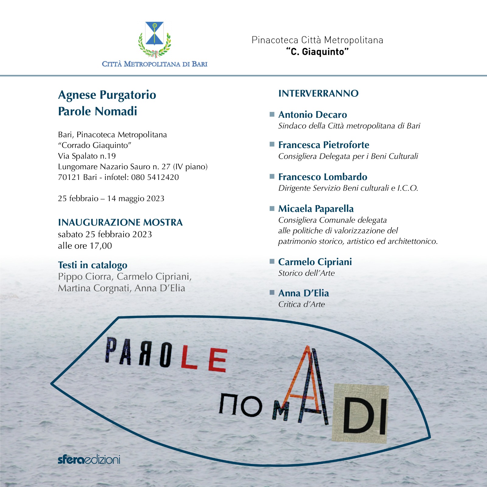 Giovedì 23 febbraio, alle ore 11.00, nella Pinacoteca metropolitana “C. Giaquinto” a Bari, si terrà la conferenza stampa di presentazione della mostra “Parole Nomadi” dell’artista barese Agnese Purgatorio, promossa dalla Città metropolitana di Bari.
