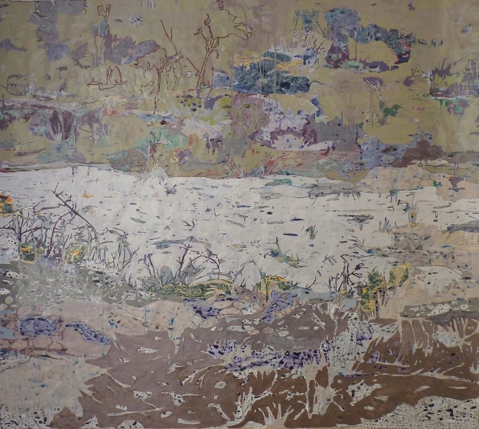 Le carte di Skujina, dalle dimensioni anche importanti, mettono in scena un paesaggio che riporta immediatamente al Nord Europa, e alla corteccia delle betulle, nei suoi colori grigi e atonali, negli spazi abitati esclusivamente da acqua e aria, da alberi e steli d’erba piegati dal vento e energicamente puntati verso il cielo che si unisce al paesaggio in un unicum continuo e avvolgente.