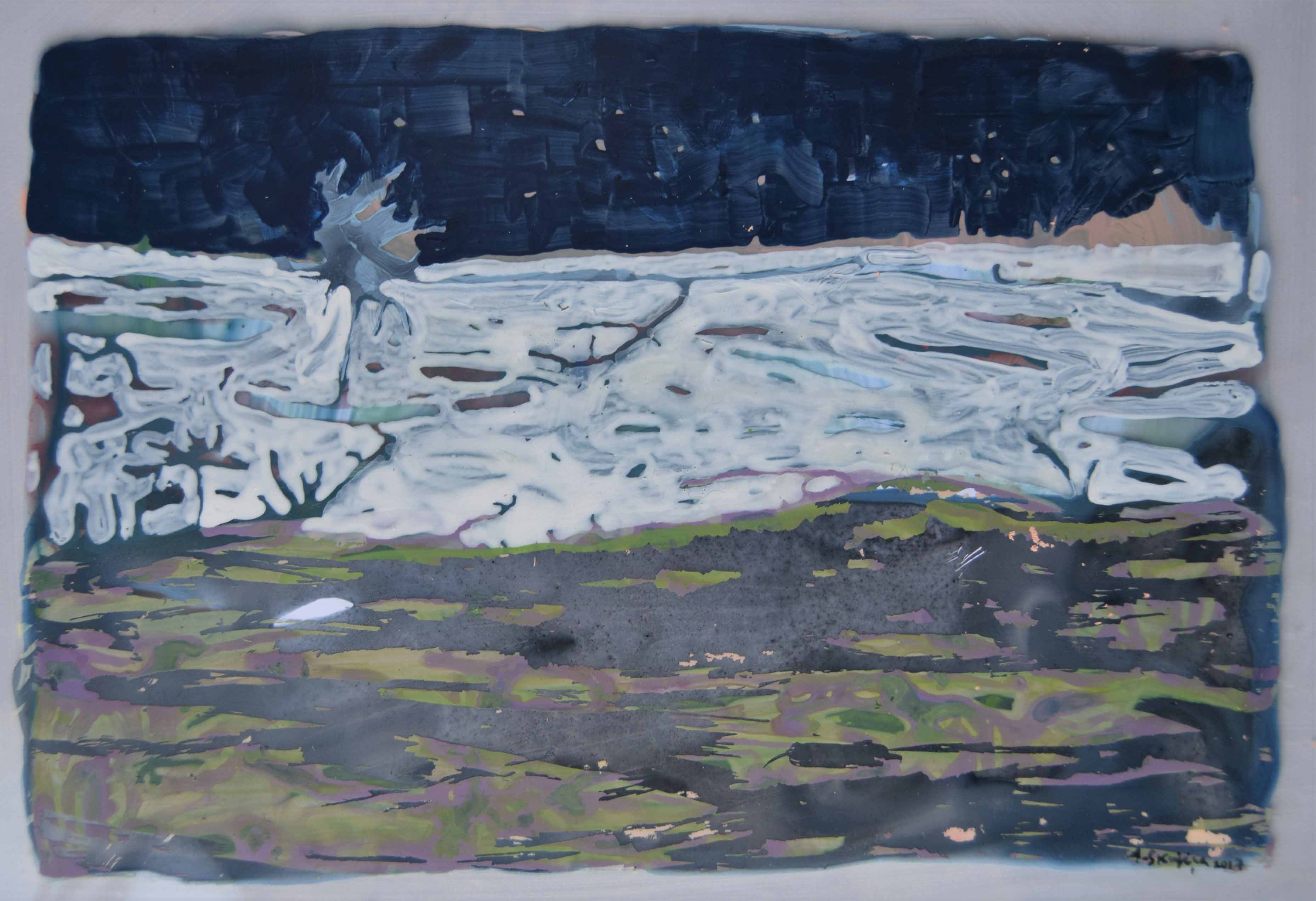 Il titolo dice molto anche della tecnica utilizzata dall’artista. Skujina lavora per livelli, ma interpreta ogni livello successivo al primo, che è la massa iniziale, non come un passaggio che aggiunge, ma come un elemento che prende lo spazio dello strato cromatico precedente, ne cancella una parte, e così il paesaggio finale nasce per differenza e non per somma.