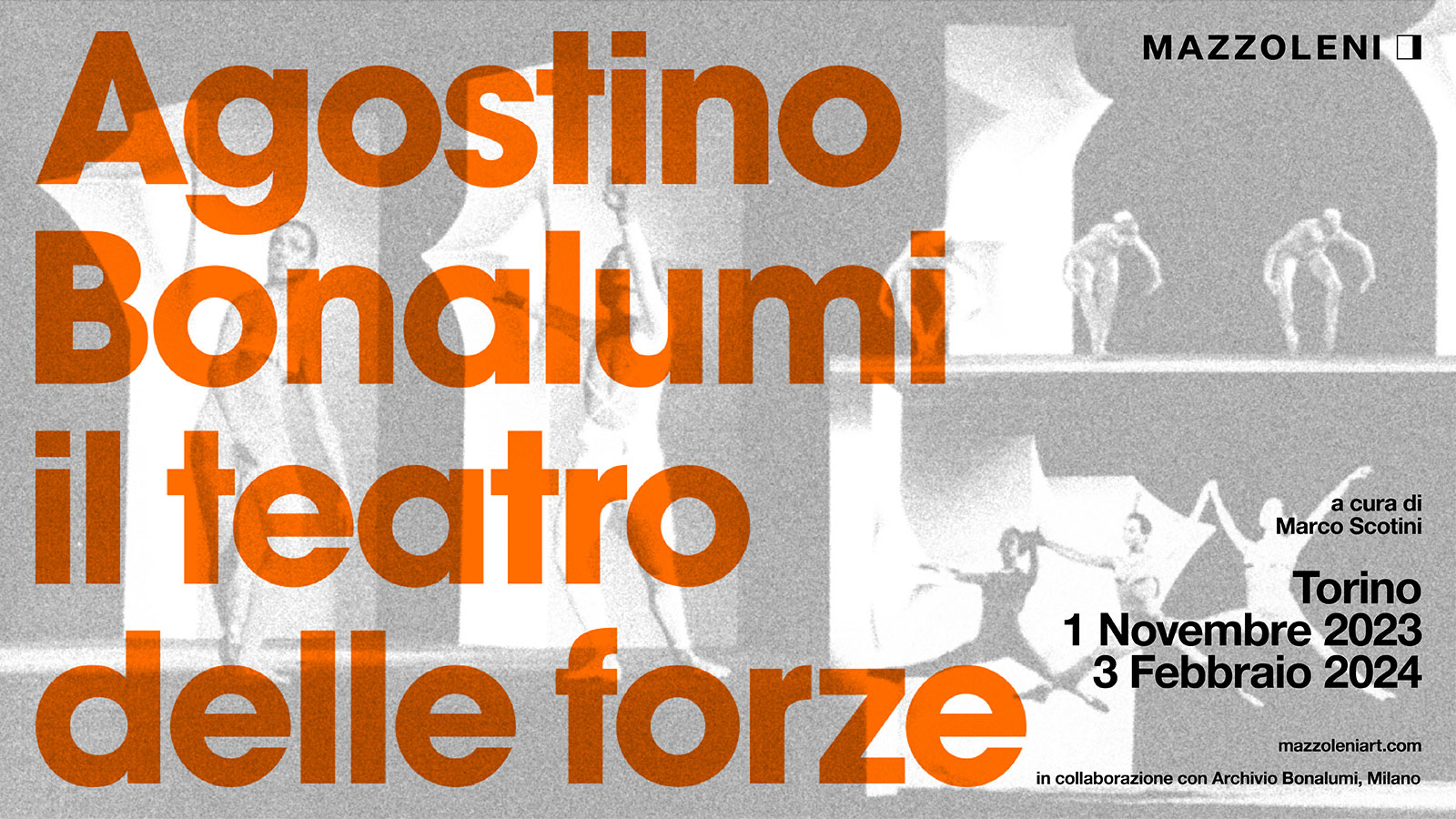 Con la mostra “Agostino Bonalumi: Il Teatro delle Forze” Mazzoleni dedica al maestro lombardo dal 1 novembre una grande retrospettiva. Sculture monumentali, documenti e bozzetti originali, la mostra si focalizza su una delle stagioni più felici dell’attività creativa dell’artista. La mostra è organizzata anche in collaborazione con la Fondazione Egri per la Danza.