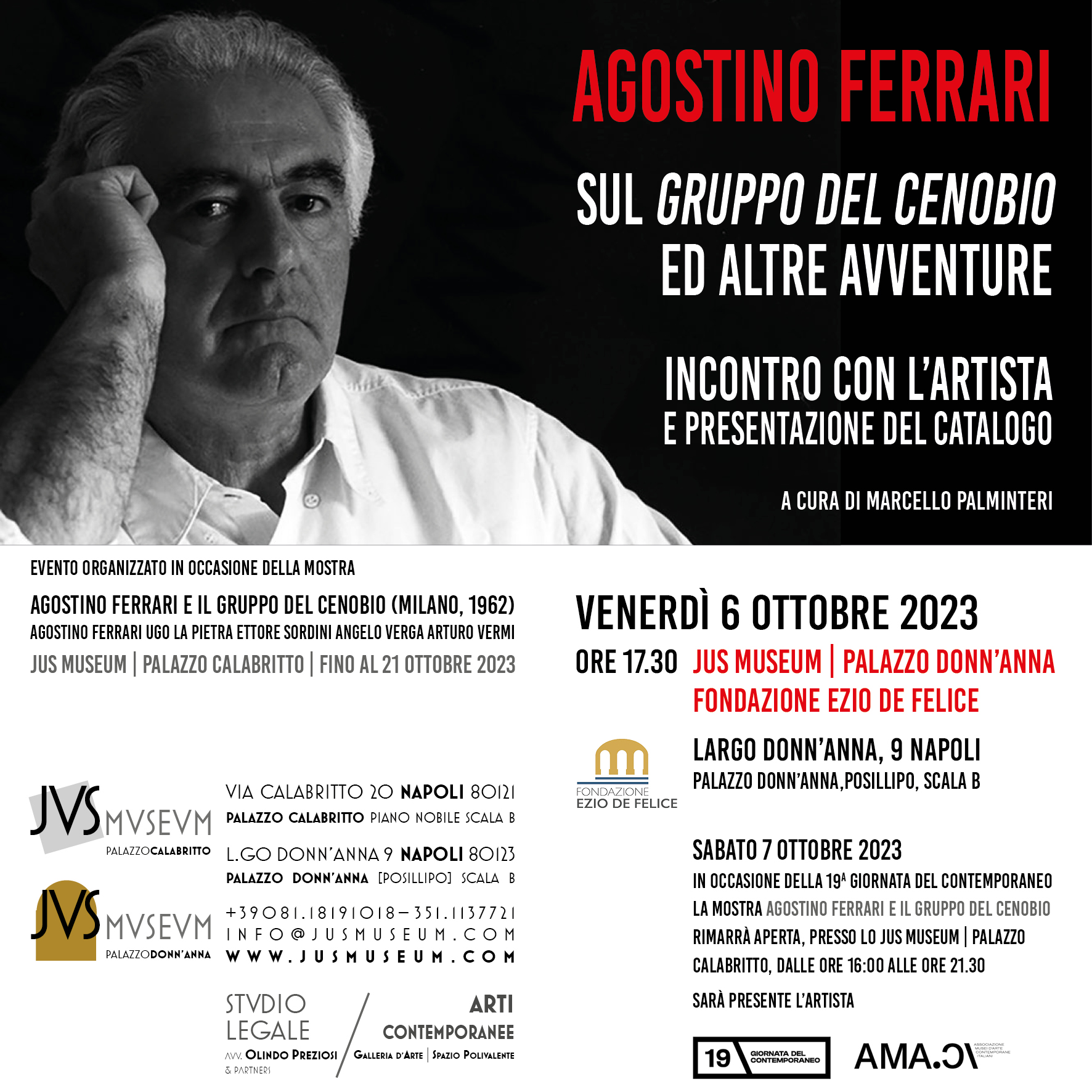 Il 7 ottobre invece, presso gli spazi espositivi dello JUS Museum | Palazzo Calabritto (Via Calabritto, 20), nell’ambito della XIX Giornata del Contemporaneo, la mostra “Agostino Ferrari e il Gruppo del Cenobio” sarà visitabile dalle ore 16 alle ore 21.30, orario in cui sarà presente l’artista.