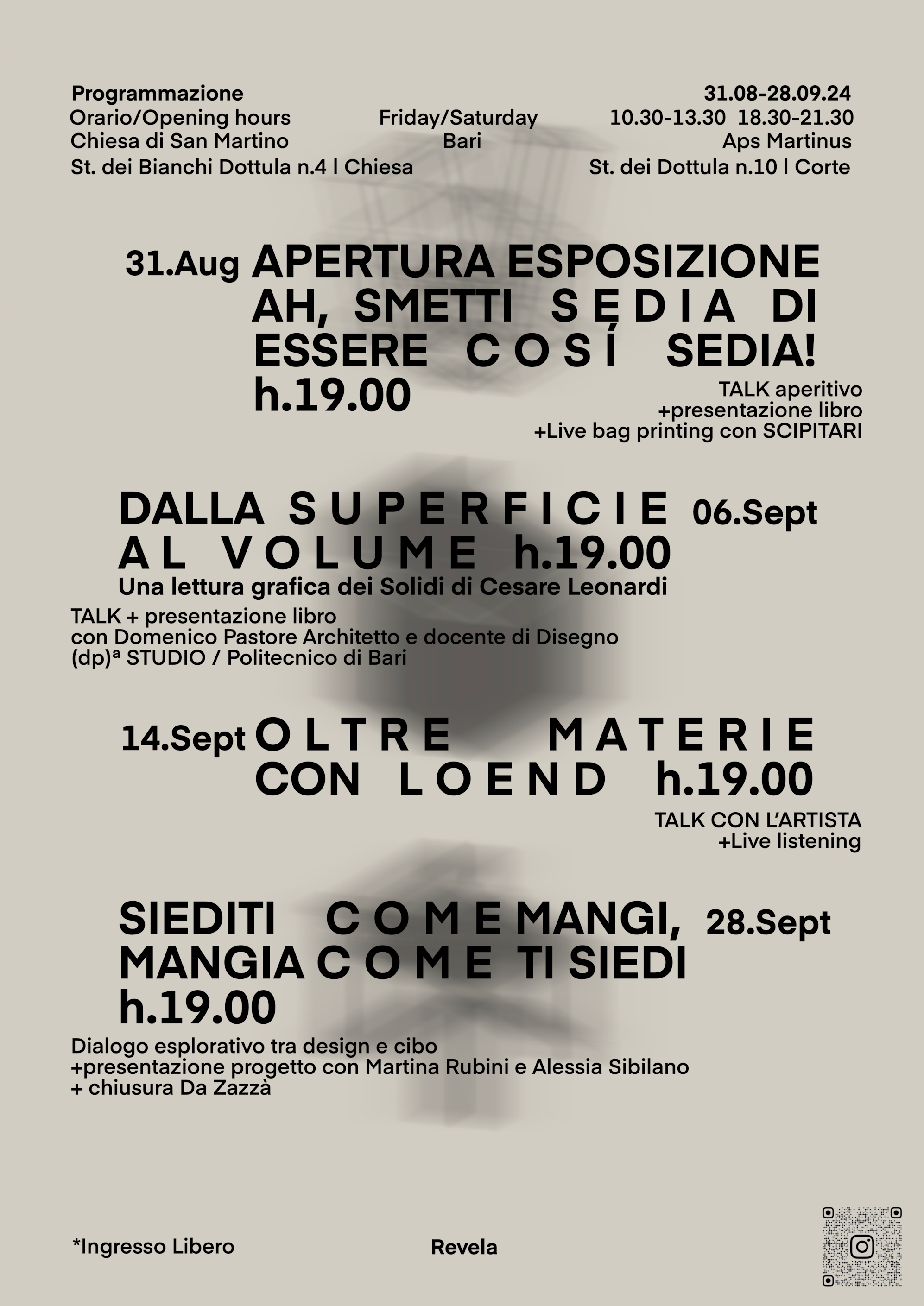 Revela, progetto di ricerca fondato dal designer Michelangelo Bove e dall'architetta Rossella Conversano per promuovere l'arte e il design contemporaneo, è lieto di annunciare la mostra d’arte e design contemporaneo dal titolo "Ah smetti sedia di esser così sedia!". L’esposizione, realizzata in collaborazione con l’Aps Martinus, si terrà da sabato 31 agosto 2024 a sabato 28 settembre 2024 presso la Chiesa di San Martino a Bari Vecchia (strada dei Bianchi Dottula n.4). Il progetto di Revela propone la creazione di un dialogo tra i giovani talenti pugliesi e la comunità locale, esplorando la sedia come elemento di design non solo dal punto di vista funzionale ma anche concettuale. La sedia diventa simbolo, veicolo di idee, e mezzo per interrogarsi su forme, materiali e prospettive artistiche singolari. La mostra è quindi un invito a riflettere su come l'arte possa diventare un mezzo per ricollegarci agli oggetti che ci circondano, sensibilizzando i talenti locali a mettersi in gioco ed esprimersi. Ogni opera esposta offre prospettive diverse uniche, interrogando il visitatore sul significato della forma, e creando un dialogo visivo che è tanto affascinante quanto urgente. La scelta della chiesa di San Martino come sede espositiva risulta anche particolarmente significativa. Situata nel cuore della città antica, questo spazio millenario ne è diventato in poco tempo un punto di riferimento culturale, incarnando quel concetto di fluidità dei confini tra pubblico e privato, tipico dei vicoli della città antica.