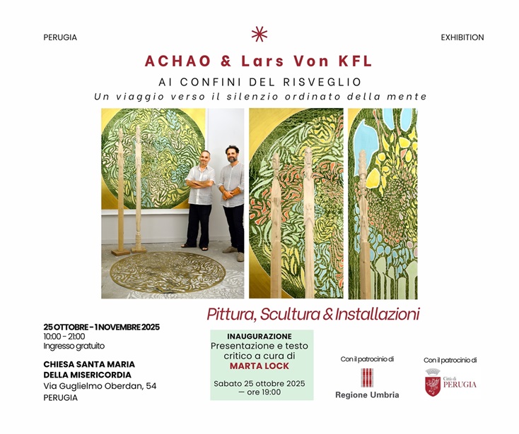 La mostra dei due artisti francesi intitolata Ai confini del risveglio, che sarà presentata dalla critica d’arte internazionale Marta Lock recentemente insignita della medaglia d’argento da parte della Société Académique des Arts Sciences et Lettres di Parigi, ha avuto l’onore di ricevere il patrocinio del Comune di Perugia e della Regione Umbria. Il vernissage avrà luogo sabato 25 ottobre alle ore 17.00 e promette di offrire un viaggio immersivo nelle atmosfere spirituali di Achao e in quelle antropologiche-primitiviste di Lars von KFL dove l’uno è complemento dell’altro poiché le forme fluttuanti e quasi ipnotiche del primo, che attinge alle forme ovoidali per evocare la rotondità della natura e al contempo una spinta a oltrepassare il mondo visibile, sembrano essere sostenute dalle lunghe figure antropomorfe del secondo, che invece si lascia ispirare dalle maschere e dai totem delle popolazioni primitive, dell’Oceania e del Nord Europa. Il risultato di questa suggestiva associazione tra i due stili genera la sensazione di entrare in un mondo parallelo dove il silenzio delle civiltà indigene si fonde alla leggerezza di una spiritualità che vede l’essere umano al centro di un percorso evolutivo che non può fare a meno di richiamare quello compiuto dall’individuo fin dal principio dei tempi.