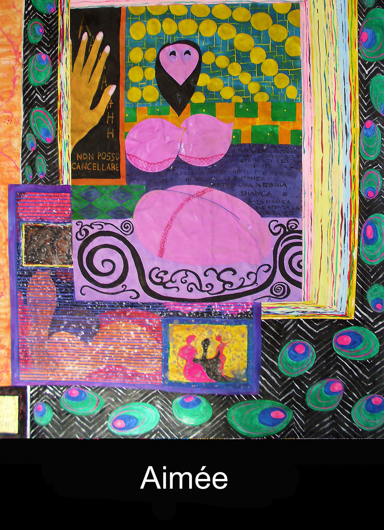 E' una inclinazione al disturbante a muovere le figure di Aimée, una speciale prassi stilistica che non pare divenire dogma, ma necessità e via di fuga dal tormento.La volontà agisce sulla volontà stessa producendo immagini che sfidano l'istinto, obbligano al rifiuto ed invitano alla riflessione naturale sull'interiorità primitiva dell'individuo.C'è una progressiva semplificazione e rastremazione dell'immagine, entro la quale le figure si riducono a silouhettes stilizzate, non identificabili, prive d'espressione e derubate di personalità. Tuttavia è proprio qui che affiora il fascino e si manifesta la malìa seduttiva dell'arte di Aimée: nell'istante in cui la figura smarrisce ogni connotazione – sia fisica che psicologica – diviene simbolo dell'azione, della forza e passione terrene e metafisiche, quasi lacerto e referente ultimo dell'umanità. Paradossalmente i movimenti innaturali guidati dalla nettezza dello stile, i corpi irreali e “descritti” sul dipinto sottolineano con ancora più forza la loro estrema vitalità, riunendo le sofferenze e i sentimenti sotterranei non dell'individuo, ma dell'uomo. Lo slancio diviene allora radicale, la successione di maschere e il moltiplicarsi dell'azione conducono all'antitesi ed elevano all'allucinazione: il dionisiaco che muove all'intorno e dentro di noi trasporta e seduce, fino ad assorbirci nel gorgo, nell'istante in cui ci distacca da tutto.
