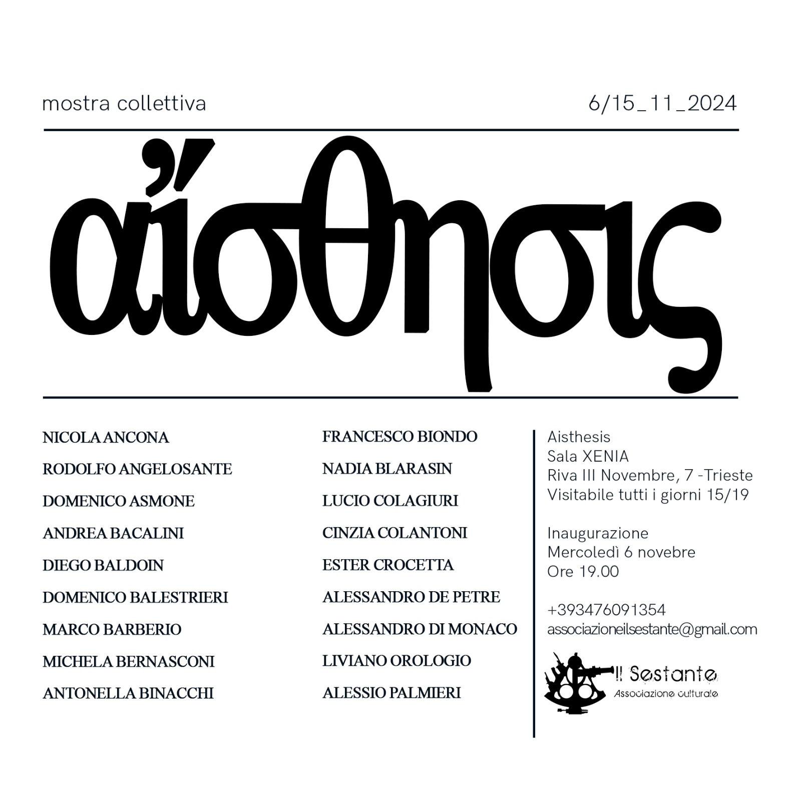 Per ulteriori informazioni, contattare Tivarnella Art Consulting o Associazione Il Sestante Email: