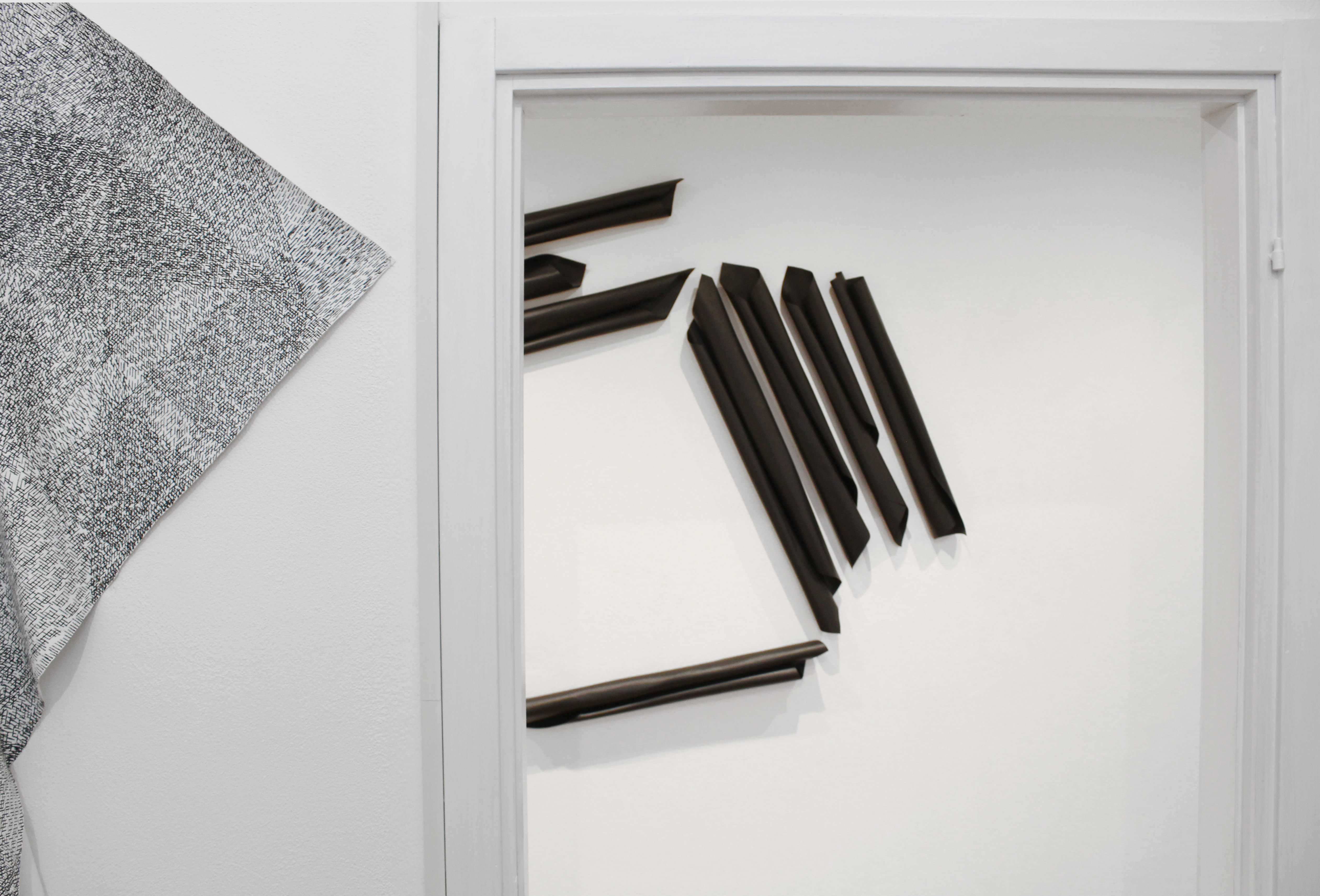 Il segno meno, intrecciandosi o rincorrendosi in infinite linee parallele, diventa una tessitura che spinge la materia a continui mutamenti, la rende dinamica, leggera come un velo che ondeggia elettrizzato da poli magnetici opposti.