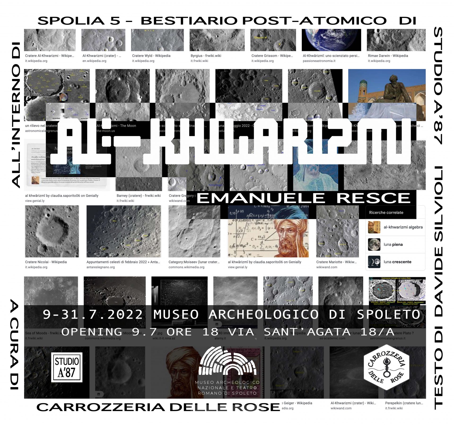 Fulcro di questa serie di lavori è l’idea di algoritmo, infatti il titolo evoca il nome del suo inventore persiano Al-Khwarizmi (IX secolo), omonimo a un cratere posto nel lato oscuro della luna. Entrambi appaiono nei motori di ricerca Google alla voce “Al-Khwarismi”. Tra gli interessi di Emanuele Resce c’è sicuramente l’algoritmo, perché è uno di quei perni che collega l’antichità all’era moderna o, come dice l’artista stesso, ‘interseca le dinamiche del mondo antico e quello contemporaneo’. Infatti proprio l’algoritmo sembrerebbe essere stato già presente nell’antico Egitto e probabilmente nella Civiltà dei Sumeri, mentre oggi è in auge nel Network .”