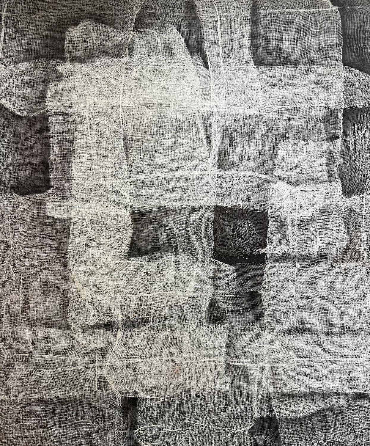L’artista presenta tre opere astratte realizzate con garza su tessuto, materiale altamente sensibile e fragile, con cui la maggior parte delle persone è entrato in contatto per medicare le proprie ferite. La natura delicata le fa somigliare a nuvole, ingannando l'occhio e l'immaginazione. L'artista, pur rispettando la natura del materiale, cerca di plasmarlo in una serie di tende, simulando la città di Gaza, che durante il genocidio ne era costellata. Gaza, spesso citata in molte narrazioni come il primo luogo in cui è stata inventata la garza, è ora una città in cui questo materiale manca tristemente nel momento in cui sarebbe più necessario.