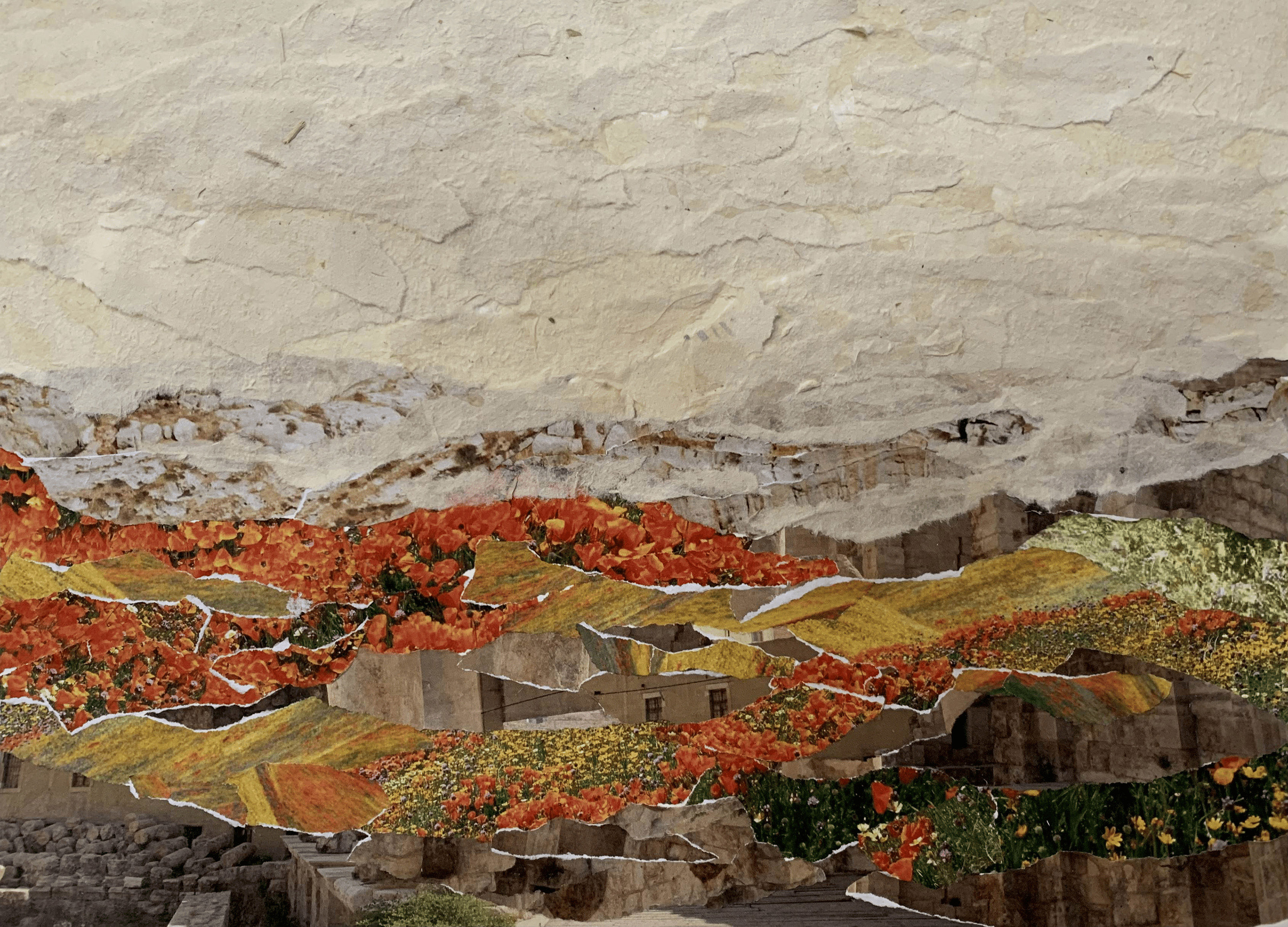 Presenta quattro opere sotto forma di collage realizzate attraverso un insieme di immagini che includono foto personali o di famiglia. L’artista taglia, rimodella e incolla insieme gli elementi per creare un paesaggio. L’opera esplora la relazione dinamica tra natura, terra e identità personale, riflettendo sia sull'ambiente reale che su quello immaginario. Solleva interrogativi sul significato che assume la terra, se esso rischi di essere perduto o se rimanga intatto, radicato nel proprio senso di identità. Attraverso scene fantastiche e esperienze sensoriali, l'opera approfondisce il tema dell’occupazione, del corpo e della connessione alla propria terra natale, invitando a una riflessione più profonda sui confini dell'identità e sulla terra che abitiamo.