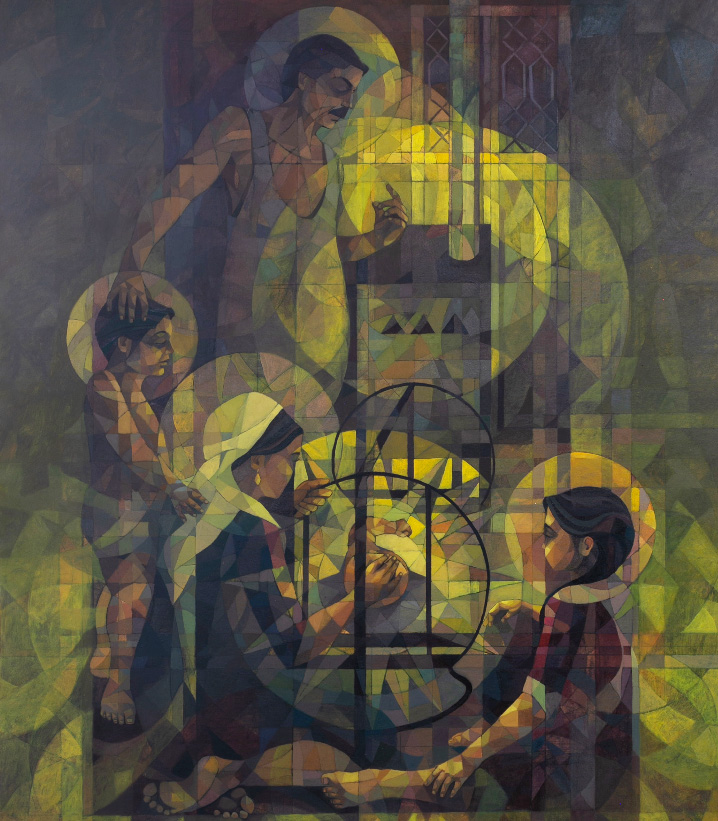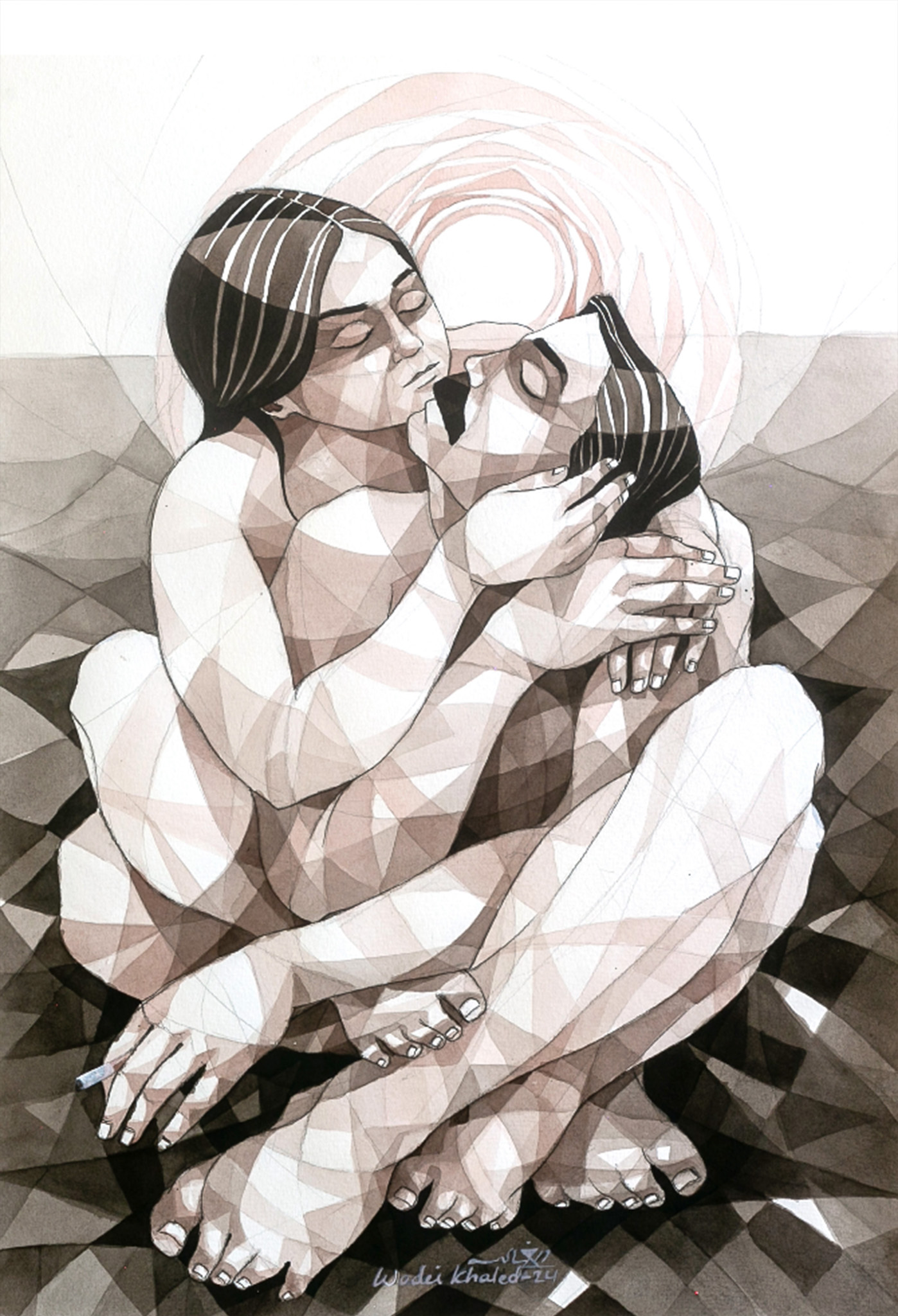Presenta tre pezzi della sua collezione “Dalla nostra finestra nel Campo”, opere affascinanti caratterizzate dalla vivacità dei colori e degli strati, che riproducono l’effetto della finestra vetrata di una cattedrale all’interno di un ambiente palestinese. Esse rappresentano una famiglia semplice, riunita nello straordinario momento di una nascita, rievocando la nascita di Cristo a Betlemme. L’artista ritrae anche l’abbraccio tra due innamorati e una ragazza che coccola un gatto, realizzati ad inchiostro in bianco e nero. Nonostante l’assenza di colore, queste opere riescono a trasmettere l’essenza dei pigmenti che il pittore tipicamente utilizza. Attraverso questi dipinti, Khaled rivela dunque che il segreto della sua arte non risiede nei colori, ma nel ritmo complessivo dell’opera, che riesce a cogliere la storia dietro alla composizione.