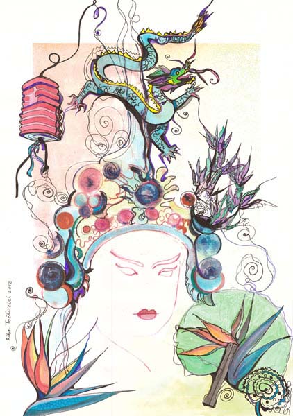 Alba Tortorici, pittrice la cui caratteristica è dipingere luoghi visitati durante i viaggi presenta al pubblico 21 opere che ripercorrono il suo viaggio in Cina, attraverso la rappresentazione di un simbolo di comunicazione e di arte importante come il teatro cinese. L’attrice cinese rappresentata da Alba Tortorici, con la sua maschera attraversa il paese dalla Muraglia Cinese alla città di Pechino, dalla tradizione del thè agli alberi in fiore. Di opera in opera ci racconta la sua visione della Cina. Il teatro vuole essere per l’artista un punto di unione tra Oriente e Occidente. Oriente perché fedele nella sua rappresentazione, Occidente perché visto con gli occhi un’artista italiana. Le origini del teatro cinese sono profonde, il teatro ha funzione educativa e ricreativa. Ha lo scopo principale di divertire e diffondere la cultura fra il popolo che era sempre stato escluso dalle principali forme culturali. A corte, il teatro ha lo scopo di intrattenere l’Imperatore. Dagli anni ’80 in poi il teatro cinese risente molto dell’influenza del teatro occidentale.