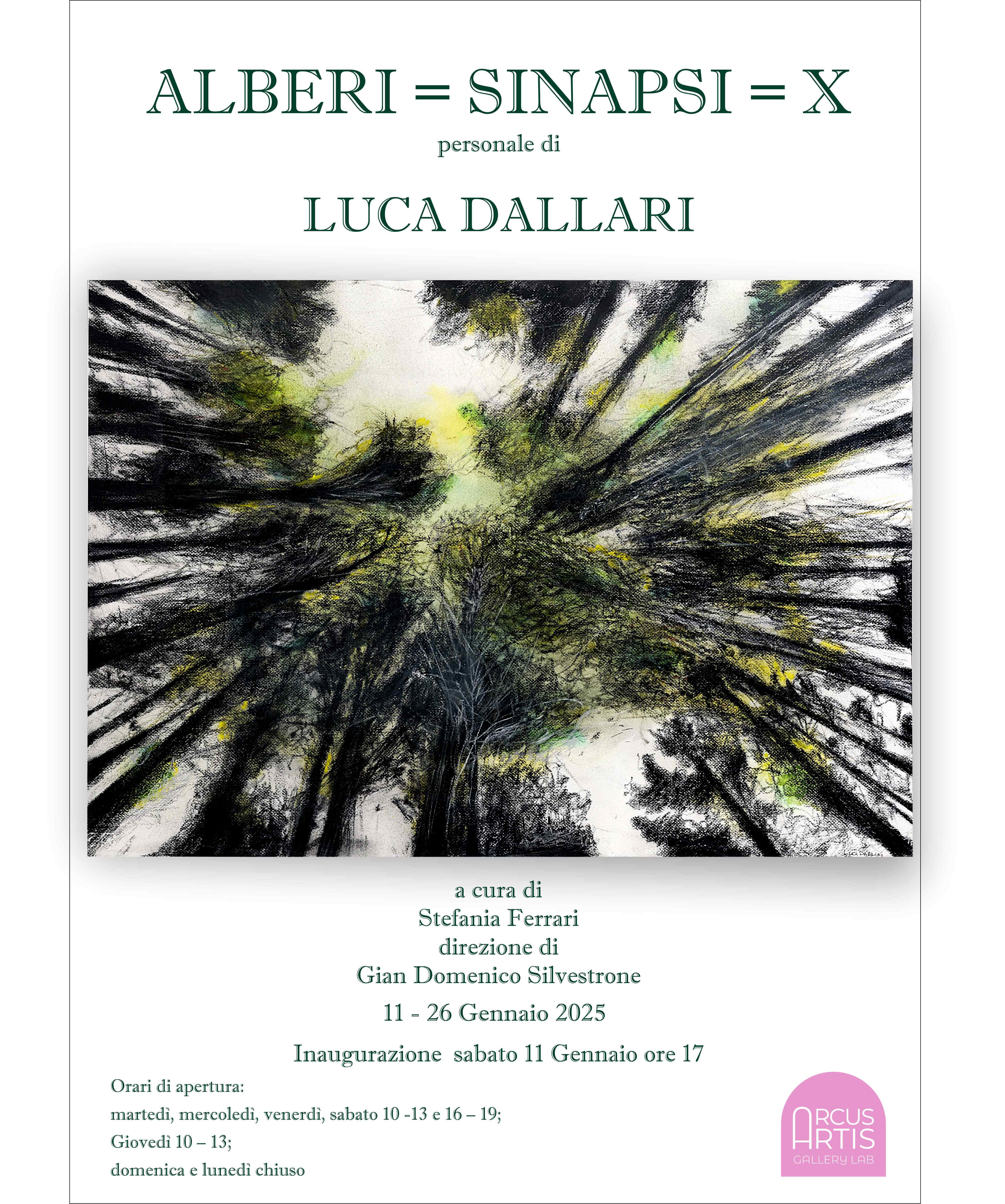 “L'artista è la sinapsi tra la sua opera e l'osservatore. Il risultato è x, l'incognita”, afferma lo stesso creativo Luca Dallari nell’illustrare il concetto della sua prima mostra personale, intitolata Alberi = Sinapsi = X presso Arcus Artis GalleryLab, in via dei Due Gobbi, 2/C a Reggio Emilia.
