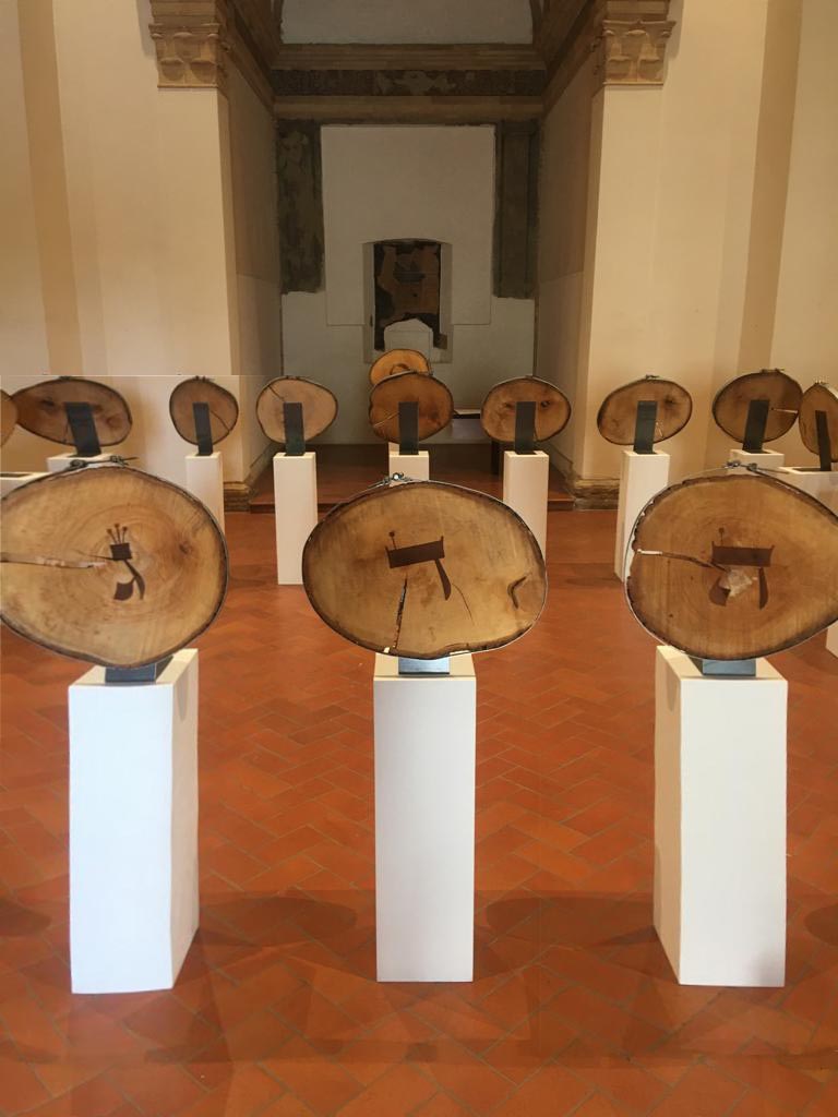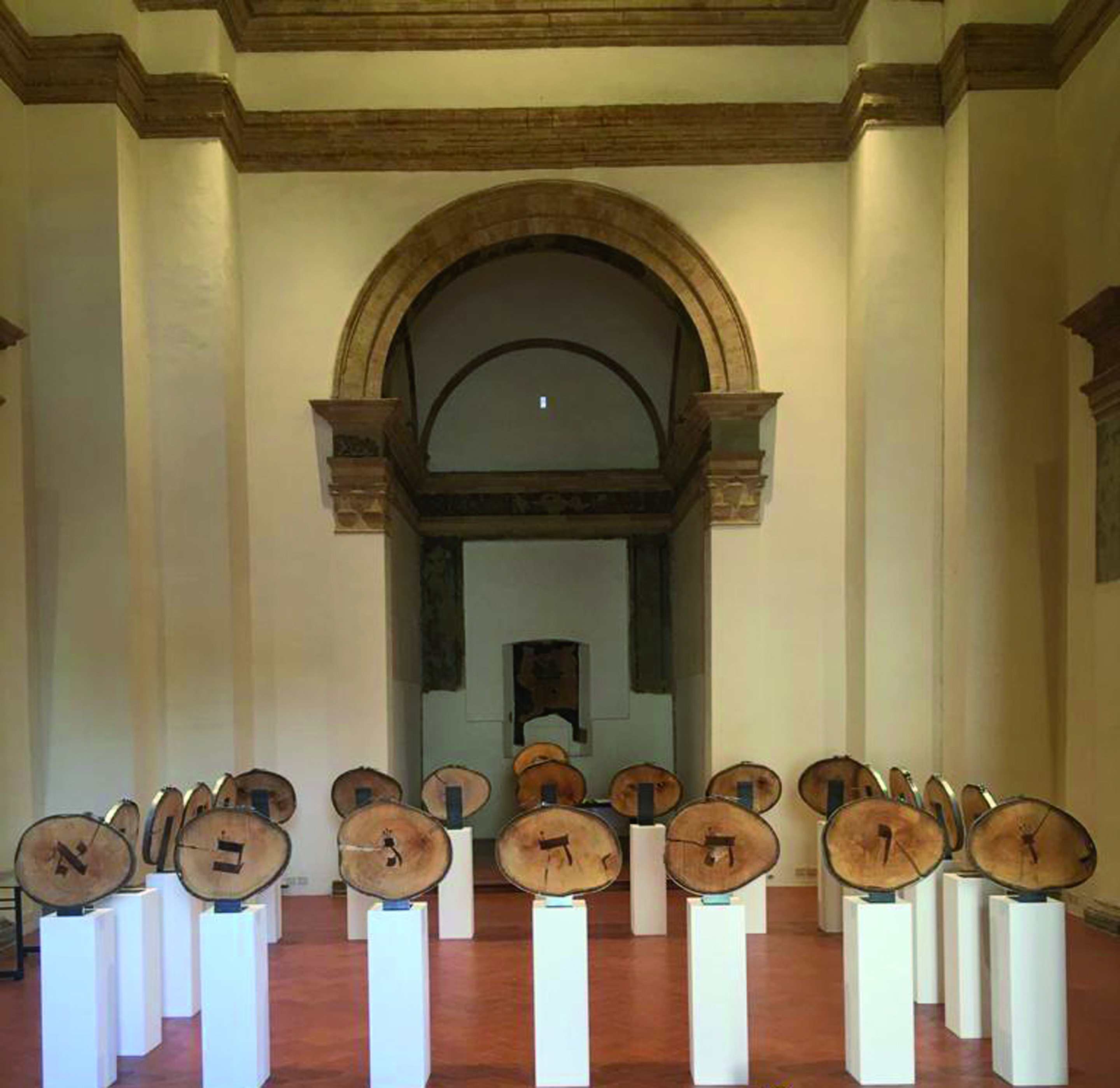 La mostra, situata all’interno di uno spazio sacro che diventa luogo di passaggio tra cielo e terra, è la metafora che racconta l’intima relazione tra uomo e natura attraverso il riuso di un albero centenario, che tagliato in sezioni diventa supporto per le lettere dell’alfabeto ebraico.