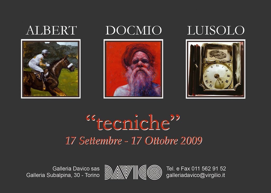 La nuova stagione espositiva della Galleria Davico si apre con “Tecniche”, una mostra a tre nomi: Luisa Albert, Docmio, Piera Luisolo. La mostra non è focalizzata su un tema comune, quanto piuttosto sulle tecniche (appunto), ciascuna specifica dell’artista cui si fa riferimento.