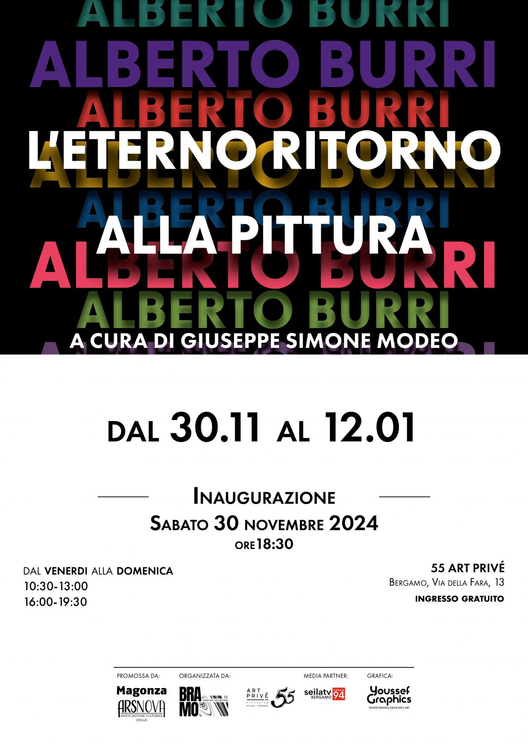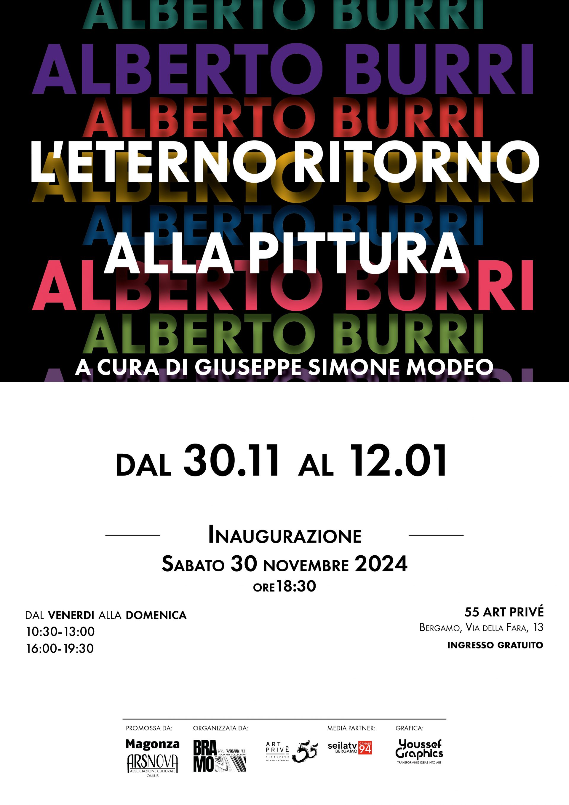 Dal 30 novembre 2024 al 12 gennaio 2025, la Galleria 55 Art Privé di Bergamo, in collaborazione con Magonza e l’associazione ArsNova, con l’organizzazione della Bramo s.r.l.s e Media Partnership di Seilatv di Bergamo, ospiterà l’esposizione Burri. L’eterno ritorno alla pittura a cura di Giuseppe Simone Modeo, dedicata al grande artista del Novecento che rinnovando il linguaggio pittorico ha saputo ridefinire i confini stessi dell’arte. Oggi più che mai, come ci dimostra questa raffinata esposizione, il suo lavoro continua a stimolare riflessioni e suggestioni sul nostro tempo.