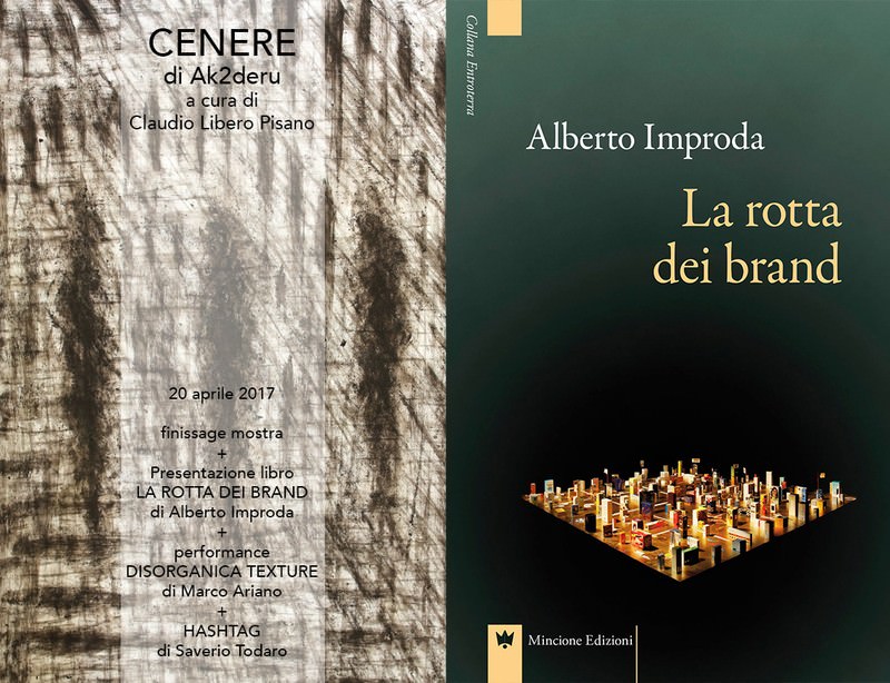 Spazio Y è lieta di invitarvi il 20 aprile 2017 nella sua sede dove si terranno il finissage della mostra CENERE di Ak2deru con la performance musicale DISORGANICA TEXTURE di Marco Ariano e la presentazione del libro LA ROTTA DEI BRAND di Alberto Improda edito da Mincione Editore. In occasione sarà esposta l’opera HASHTAG di Saverio Todaro.