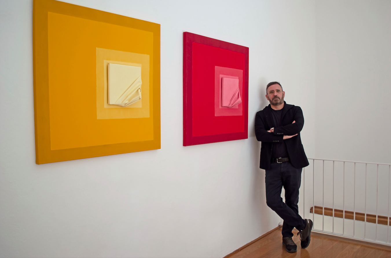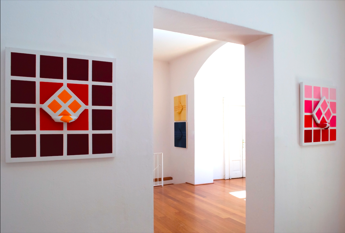 Un tema caro all’artista che adesso abbandona i suoi dipinti angolari per cedere il passo a rigorose cromie quadrate dove la sovrapposizione centrale di quadrati più piccoli, talvolta centrati, talvolta ruotati alla maniera di rombi, conferisce una piacevole dimensione di sorpresa. Le sue tele restano oggetti-evento, consapevoli dell’eredità rigorosa e plastica dell’Op Art, delle sperimentazioni del Bauhaus e soprattutto della pittura oggetto italiana, che pur incorporano una variante emotiva, immediata e imprevista, un angolo che si piega. Che ci lascia uscire fuori per ciò che siamo.