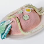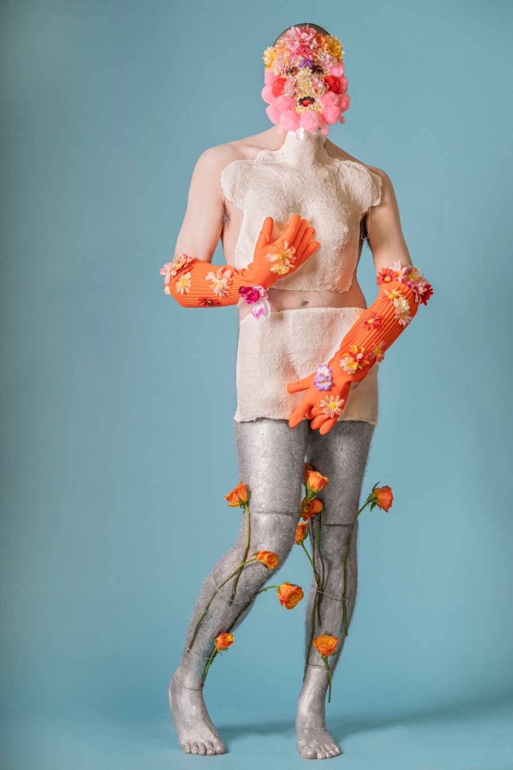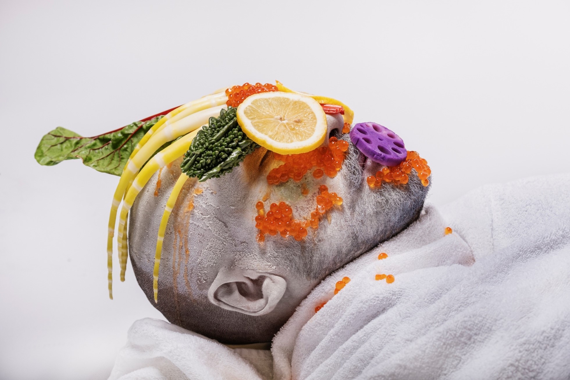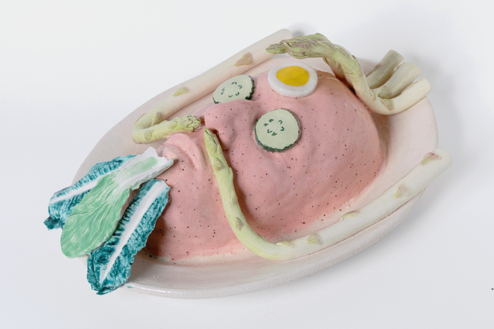 L’allestimento adotta e distorce l’estetica asettica — ma a tratti kitsch —, rassicurante e performativa di uno spazio dedicato alla cura del corpo e all’ottimizzazione dell’immagine personale: lettini da trattamento, superfici lucide, luci fredde, strumenti tecnici e oggetti quotidiani convivono con sculture di ceramica policroma, video e installazioni, trasformando la cornice espositiva in un ambiente ambiguo e immersivo, a metà tra lo showroom, spa e laboratorio biopolitico.
