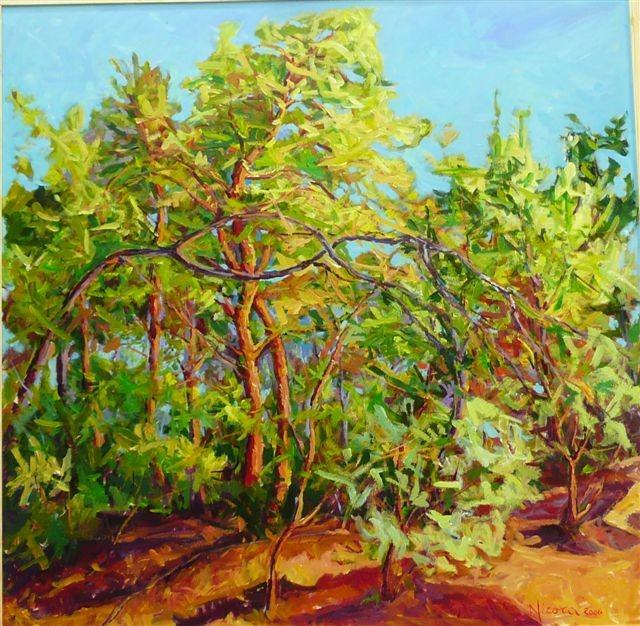 Così, la pittura di Alberto Nicora, che poggia su angolazioni realistiche, fatte di paesaggi, piccole piazze, ampie facciate, piccole pagine della vita quotidiana, ma anche di grandi mari e di giardini nascosti, presenta, pur nella pacatezza serena di una veduta, esplosioni luministiche che s’avvicinano a quell’aura magica che possiede la vibrante tensione di una pittura metafisica.