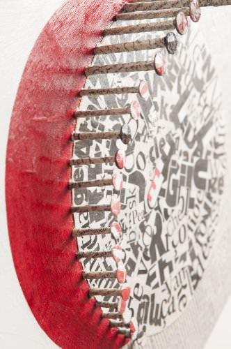 La pagina di giornale diviene una sorta di base per voli di fantasia che sembrano dover essere trattenuti solo da lunghi chiodi, non a caso rivestiti di parole, quasi a richiamarci a non vedere le cose del quotidiano solo per quelle che sono, nella loro necessaria transitorietà…