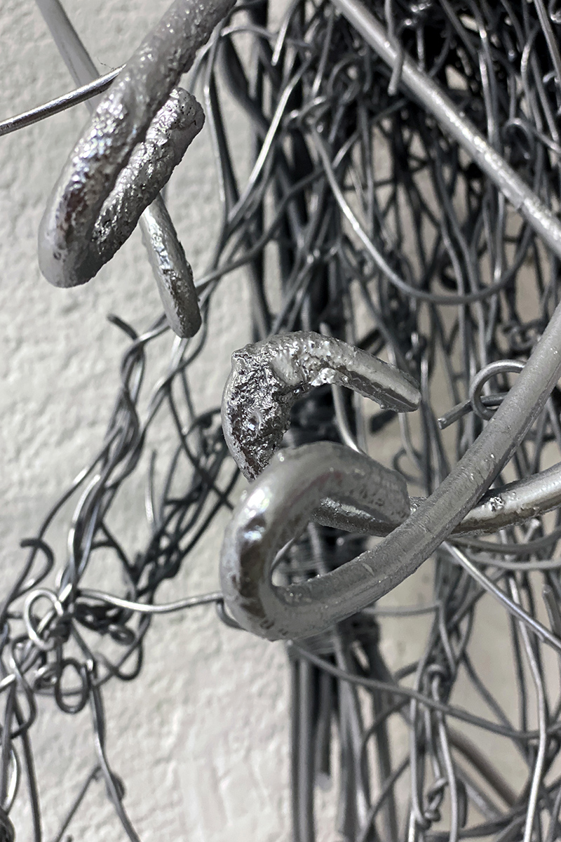 Allo stesso modo, nuove forme di vita si sviluppano in uno spazio asettico, delle teste cave composte da un’infinità di filamenti ferrosi compaiono sui muri come delle formazioni vegetali spontanee. Portatori di un’incombenza spaziale tipica di alcune formazioni rocciose, questi grovigli sembrano imitare l’articolata conformazione delle radici o dei rami degli alberi. Un certo potere tattile e visivo incastra e trattiene lo sguardo.