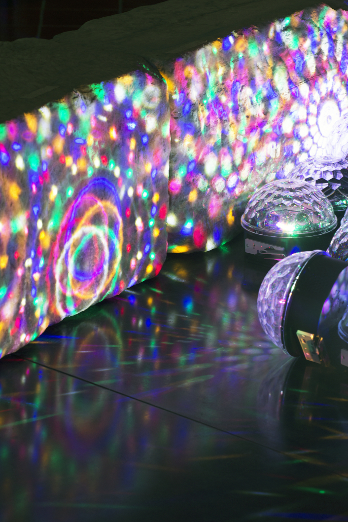 ECOTRANCE è un’unica grande installazione visiva e sonora dai molteplici aspetti e significati: l’opera si presenta “come una riflessione intorno all’acqua, intesa come sinonimo e metafora di vita, come elemento di definizione dello statuto identitario del luogo. È un’acqua caldissima che mostra la sua prossimità ad un cambio di stato, all’evaporazione, alla sparizione eterea.” [A.T.] Il lavoro è composto da 100 sfere a Led stroboscopiche che leggono una playlist di file audio elaborata a partire da una registrazione del loro stesso rumore di funzionamento. La scultura si dirama a partire da 5 cablaggi che alimentano 20 sfere ciascuno. Ogni porzione del lavoro si attiva e disattiva secondo un algoritmo casuale in un range di tempo che va da uno a trenta minuti, senza mai permettere una totale accensione o un totale spegnimento delle parti. L’attività luminosa e sonora è sempre in divenire, prossima ad una modulazione infinita di variazioni.