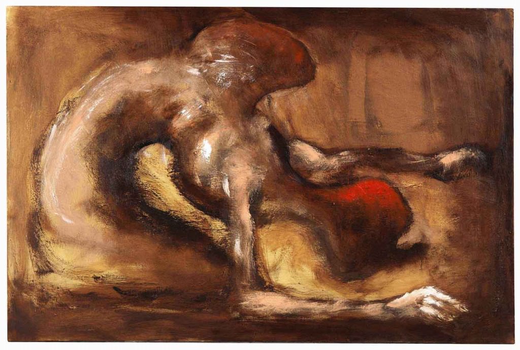 Nella pittura di Alberto il gesto ripercorre l’anatomia spezzata, avvolge le forme, si fa oggetto carico di forza espressiva, di profondità greve. Sulla superficie ampia dalla materia scarna invita alla percezione della forma. I corpi occupano lo spazio della pittura che non vuole essere descrizione ma essenzialmente contemplazione, il luogo del pensiero che sollecitato dall’immagine si rigenera in un apparente disagio e si manifesta come tensione ad un ordine alternativo.