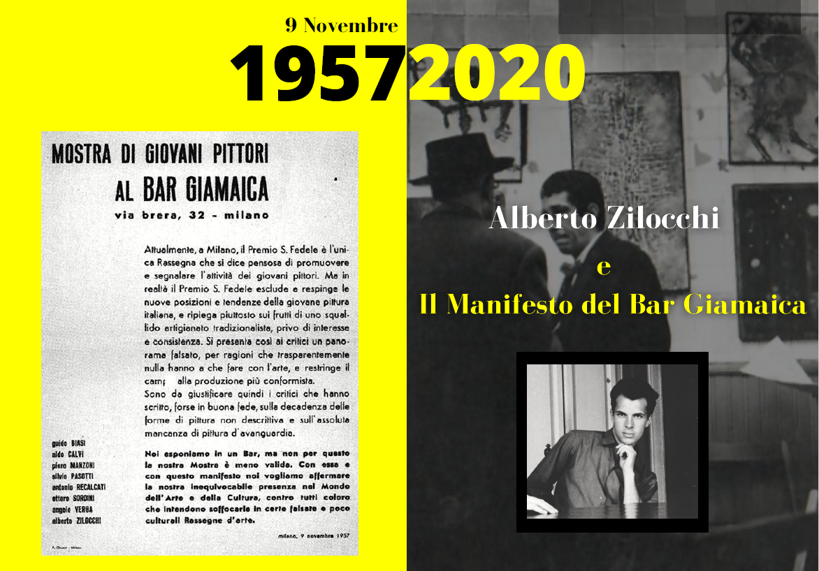 Quest’anno, l’Archivio Alberto Zilocchi festeggia con un evento digitale sui suoi canali social e sul suo canale YouTube “Archivio Alberto Zilocchi” la ricorrenza della Mostra di Giovani Pittori al Bar Giamaica, tenuta il 9 Novembre 1957 da 8 Artisti frequentatori del noto bar di via Brera 32 a Milano. È quindi il 63° anniversario! Gli Artisti, tra i quali ricordiamo in particolare Alberto Zilocchi e Piero Manzoni, nella stessa esposizione presentarono il documento passato alla storia dell’arte italiana come Il Manifesto del Bar Giamaica in cui affermavano la loro “inequivocabile presenza nel Mondo dell’Arte e della Cultura” e l'arrivo della “pittura d’avanguardia“, in contrapposizione allo “squallido artigianato tradizionalista, privo di interesse e consistenza”. Pittura d’avanguardia che, da quel momento e negli anni successivi, i giovani movimenti artistici milanesi portarono ad affermarsi in Italia e in Europa, come testimoniano in particolare le 13 esposizioni organizzate nella Galleria Azimut di via Clerici 5 a Milano fondata da Piero Manzoni e da Enrico Castellani. La prima esposizione iniziò il 4 Dicembre 1959 e l’ultima il 21 Luglio 1960. Alberto Zilocchi partecipò alla prima mostra collettiva – e seconda mostra in termini temporali della Galleria - inaugurata il 22 Dicembre 1959 e terminata il 3 Gennaio 1960. Queste mostre evidenziarono gli stretti collegamenti che Alberto Zilocchi, Piero Manzoni e gli altri artisti delle Avanguardie Milanesi intrattennero con il Movimento Zero, uno dei movimenti più innovativi sorto in Europa a cavallo tra i due decenni ’50 e ’60, decisivo nella ridefinizione del termine arte contemporanea. In Zero si trovarono infatti tutti insieme gli avanguardisti provenienti da esperienze diverse (cinetiche, programmatiche, optical, analitica, gli esponenti dei Gruppi N, T, Nul, Grav e soprattutto la realtà che si mosse intorno ad Azimuth), tutte proiettate al superamento dalla tradizione pittorica, che trovò il grado zero nell'uso innovativo del monocromo (come non ricordare a tal proposito i Rilievi, monocromi in bianco acrilico opaco con estroflessioni di Alberto Zilocchi, e i gli Achromes di Piero Manzoni) e poi nella sperimentazione di nuovi materiali per esaltare la luce, il movimento e lo spazio intesi come soggetto e medium dell'opera. Gli 8 Artisti che animarono la Mostra di Giovani Pittori al Bar Giamaica e sottoscrissero il Manifesto del Bar Giamaica furono: Piero Manzoni, Alberto Zilocchi, Guido Biasi, Aldo Calvi, Silvio Pasotti, Antonio Recalcati, Ettore Sordini, Angelo Verga.