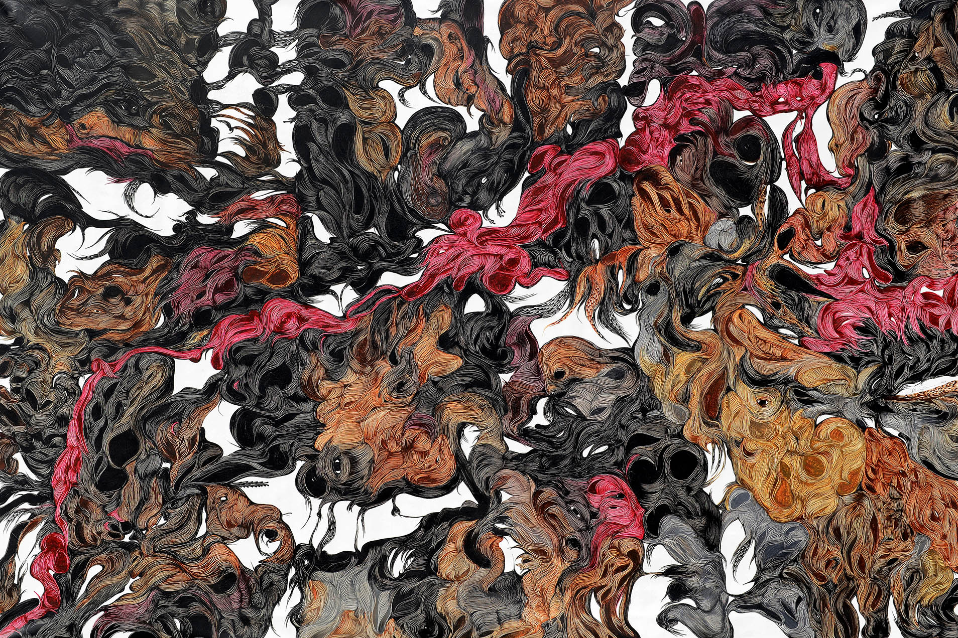 La personale dell’artista kosovaro negli spazi della Cam factory propone un percorso espositivo accattivante dove 6 tele monumentali sorprendono per le forme astratte e contorte che si inseguono in un palpitare di intense ondulazioni. Il serpeggiare continuo di linee sottili suggerisce un moto perenne così la composizione si carica di un’energia pulsante, le vibrazioni del titolo della mostra, che si propaga in tutte le direzioni. Lo spazio prende vita grazie ad elementi stranianti, piccoli occhi sembrano affacciarsi attraverso le fessure lasciate libere nel gioco delle sovrapposizioni. Che siano segnali di una realtà virtuale o segni onirici sono questi i simboli di un distacco dall’opera dell’artista che ormai lontano trascina l’osservatore verso il fondo dell’inconscio. Alla sua prima mostra in Italia Albulen Neziri, classe 1988, ha esposto in numerose gallerie e istituzioni in Kosovo e all’estero, la sua pratica artistica comprende oltre la pittura anche la scultura in cui il suo personalissimo linguaggio trasforma in tridimensionalità il moto inquieto delle sue opere.