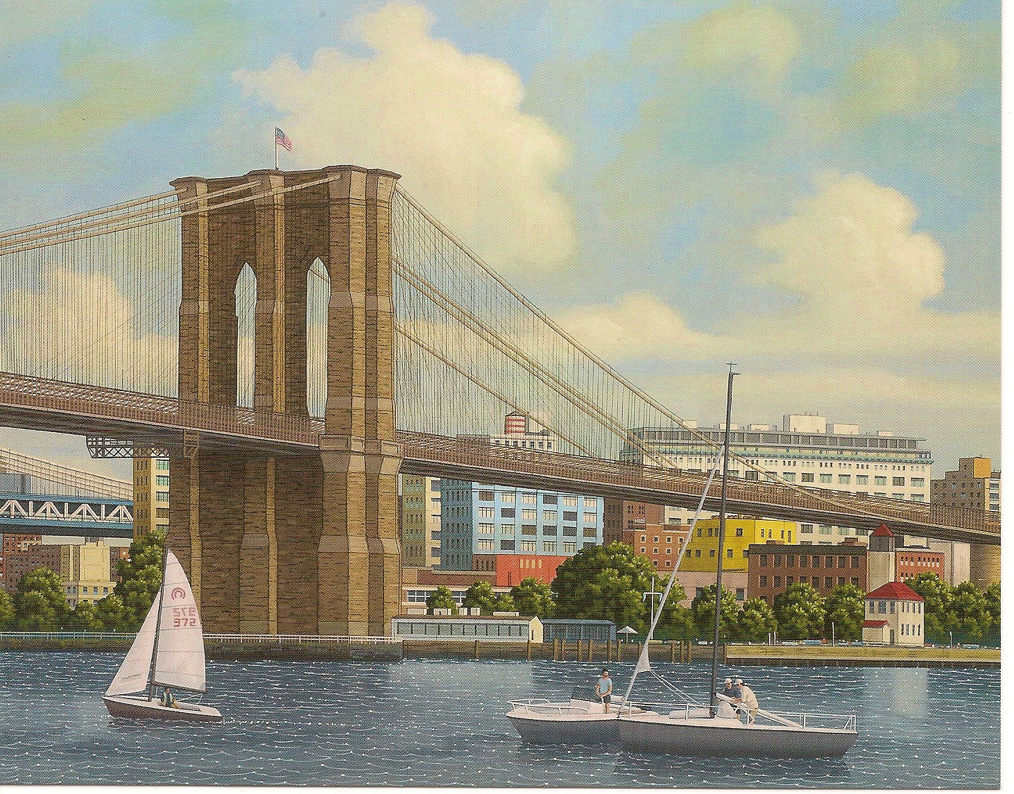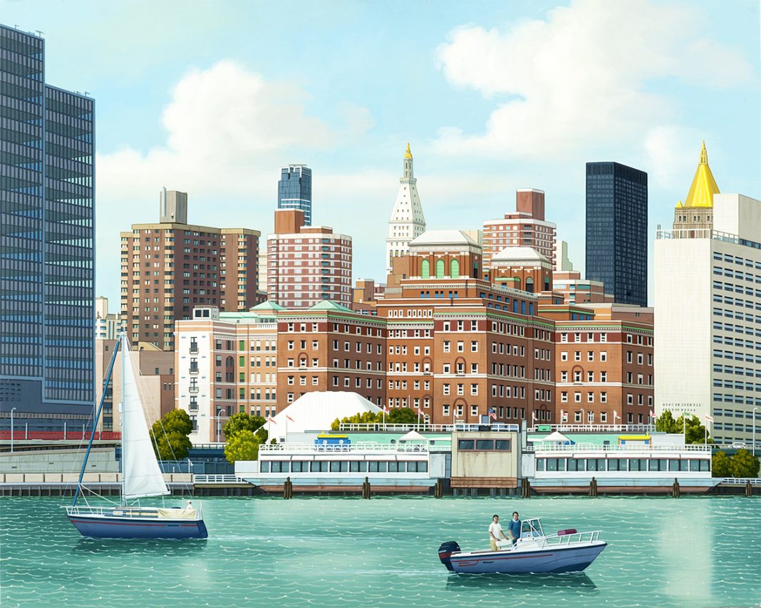 La città è il luogo di elezione, ritratta nei diversi momenti, in una maniera personalissima, tramite l’invenzione della serie Venezia/New York, che risale agli anni Novanta. Damioli dipinge New York, la città emblema della modernità, partendo dalla maniera dei Vedutisti settecenteschi. Ampi spazi di cielo, attraversati da nuvole in corsa, acque placide e tranquille, quindi il profilo articolato dei palazzi e delle case, con una scrupolosa minuzia di dettagli: finestre, porte, tetti, tegole, camini, comignoli. E ancora le imbarcazioni e la gente che vive e gravita sul territorio della città. L'effetto nell'osservatore è una sorta di corto circuito rispetto a quanto tradizionalmente ci si potrebbe aspettare, ma questo da sempre è l'intento di Damioli, ovvero la trasformazione del consueto e addirittura del banale in un fatto estetico _ricordiamo il ciclo delle Pizze negli anni Ottanta_ attraverso lo stile e il linguaggio, allineando lo stile al soggetto.