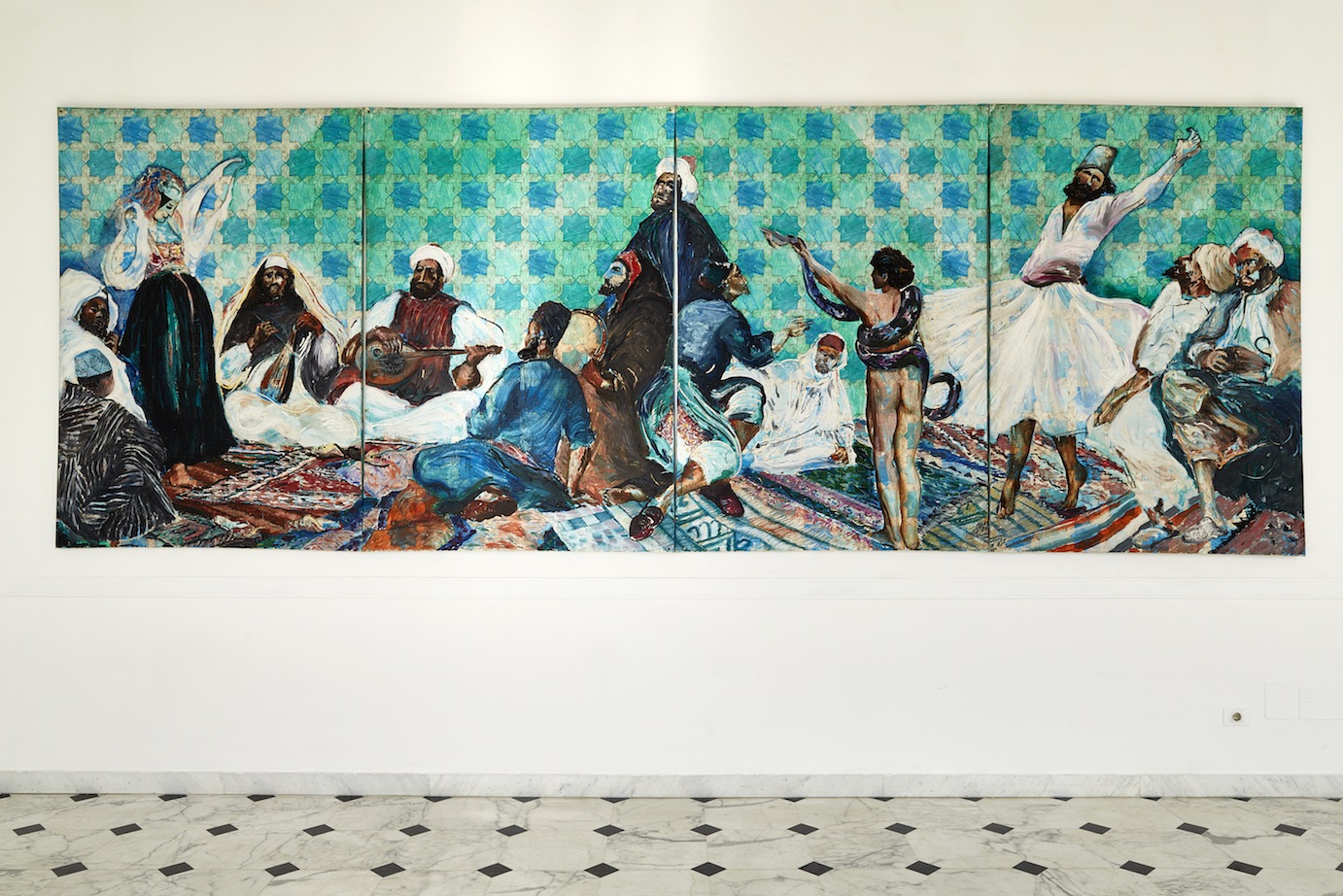 La mostra si articola attraverso opere realizzate in un arco temporale compreso tra gli anni ottanta e i primi anni duemila, tra dipinti su linoleum e sculture di medie e grandi dimensioni provenienti da importanti collezioni pubbliche e private, in un percorso coinvolgente teso all’approfondimento di una visione simultanea dell’evoluzione poetica di questo grande artista. Particolarmente affascinante il tema arabo, nato alla metà degli anni Ottanta, che dà origine a figure che si muovono in uno spazio immaginario: donne algerine, ebrei di Costantina, mercanti, questi ultimi, raffigurati tra la seconda metà degli anni novanta e il 2001, visti in Marocco. Sono ritratti esotici di uomini in abiti tradizionali che espongono la loro merce, lana, mollette e souvenir vari, intensi fotogrammi che ci portano in un mondo e in abitudini di vita completamente diverse dalle nostre. I dervisci, invece, danzano in una preghiera collettiva che li porta a levitare nell’aria, in un abbraccio ideale avvolto dalla spiritualità, accanto ai rabbini, i maestri, i saggi, che tanto hanno affascinato l’artista.