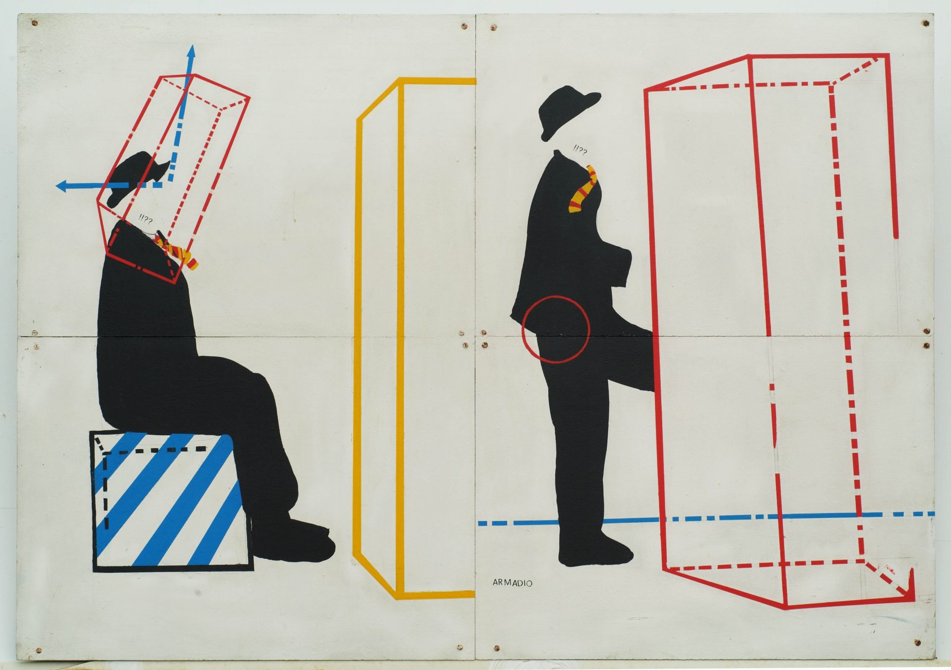 Si tratta di quadri del periodo 1968 - ’69, rigorosamente su tavola, che vanno a comporre immagini iconiche, ironiche e concettuali in continuo movimento.
