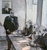 Infatti nella sua pittura, pur senza volontà narrative, emergono dei simboli chiari che denotano delle situazioni a tratti grottesche. In un’opera recente, si può osservare una sorta di riunione tra ufficiali tutti coperti da una maschera antigas che rende un clima surreale, sotto l’ombra del ritratto di Lenin.