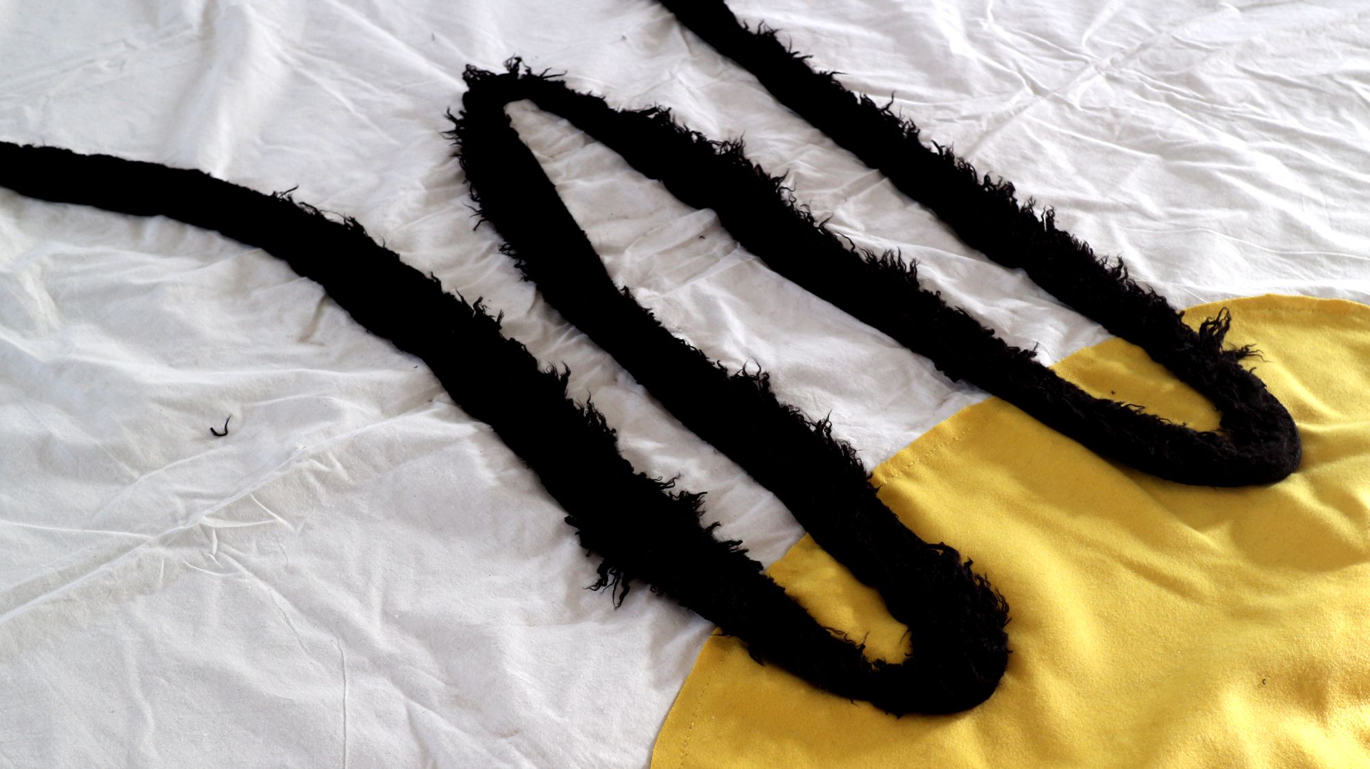 La galleria sarà invasa da due enormi animali, rappresentati con un disegno essenziale, tra l’infantile e l’arcaico. Tele in cui l’artista ha cucito della stoffa evocando immagini primordiali simili a pitture rupestri.