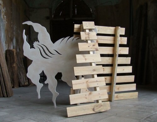 L’aria si riassume in cieli leggeri inseriti in triangoli di alluminio con tratteggi e campiture che restituiscono il movimento della brezza e del vento. L’acqua inserita nei quadrati o triangoli della vita prende massa e portata, a volte esile tratto, a volte elegante acquitrino dove il piccolo principe nasce come fossile vitale, o pietra della sapienza.