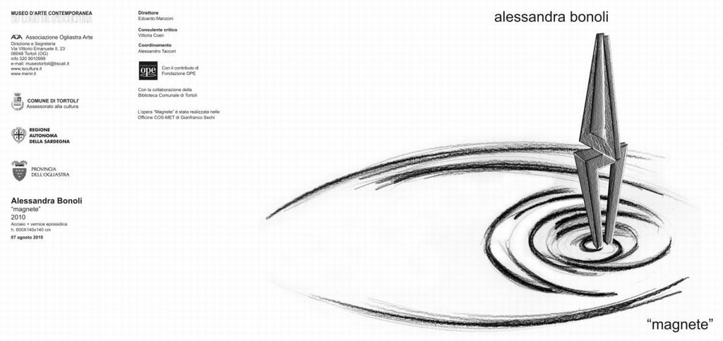 La mostra personale di Alessandra Bonoli nella Galleria d’Arte Contemporanea di Tortolì, ex Bloccheria, con una decina di opere di piccole dimensioni, bozzetti preparatori e un video che proietta alcune sue poesie, completa il percorso attraverso il quale si realizza la monumentale scultura intitolata Magnete, progettata nel 1996 e realizzata in ferro appositamente per il museo all’aperto di Tortolì con un’altezza di sei metri. L’opera è in ferro, ed esprime un costante rapporto con le forze naturali, alle quali l’uomo si lega, per disposizione e inclinazione.